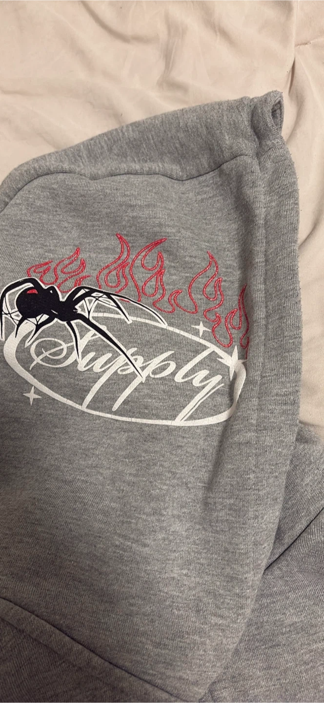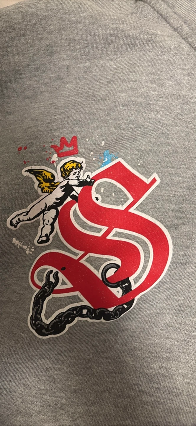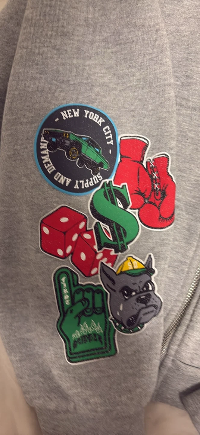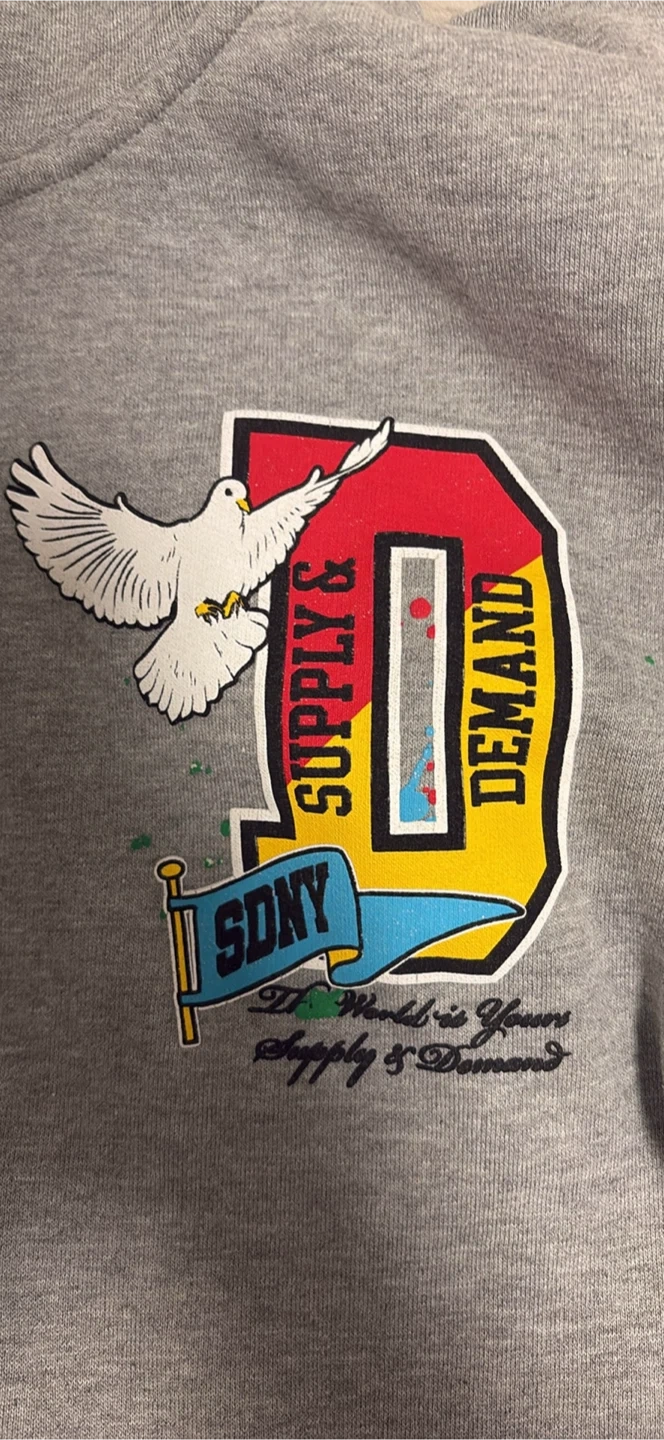 0Selling a grey Supply & Demand hoodie. It features various designs and logos throughout the sleeves and body of the hoodie. Great for casual wear!