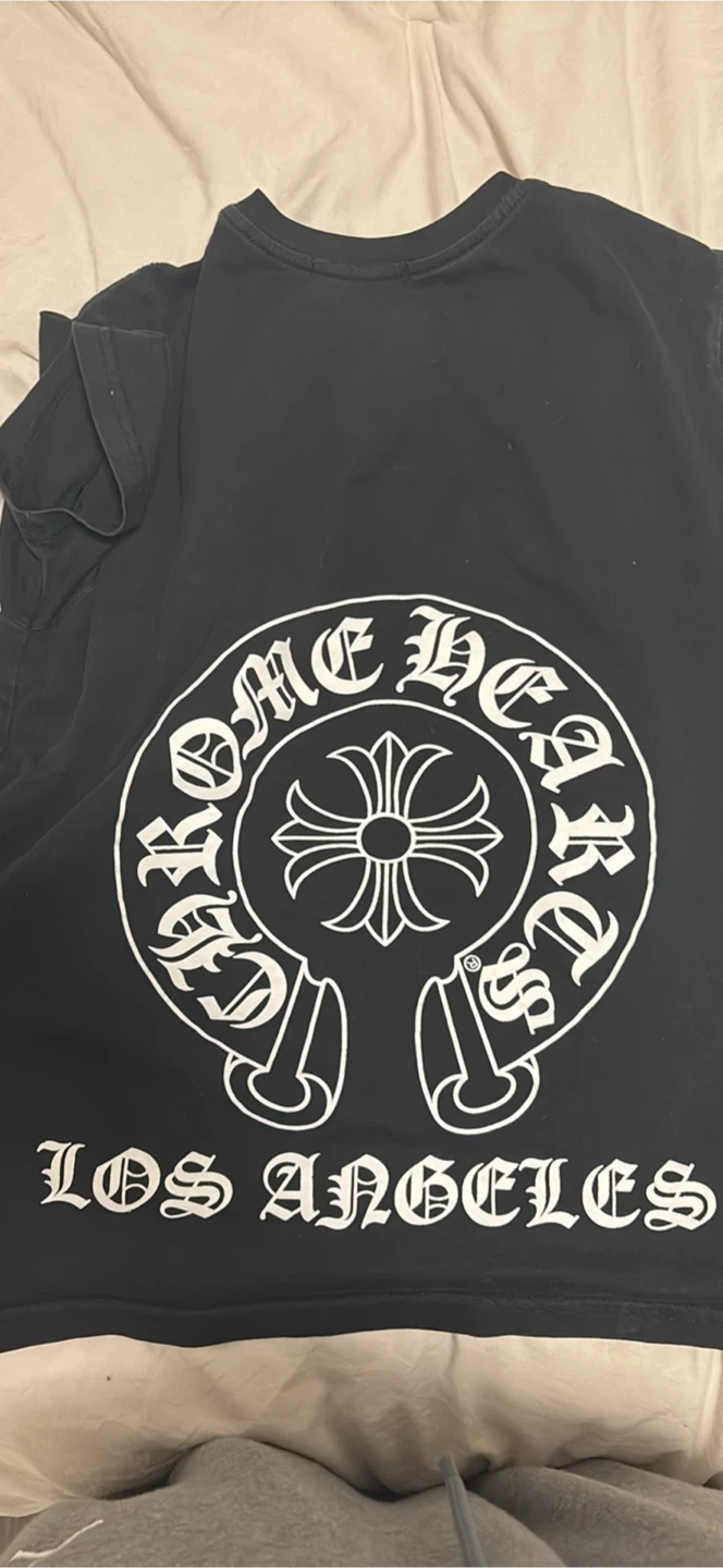 0Selling a black Chrome Hearts t-shirt! It features the iconic Chrome Hearts logo on the front pocket and back. The shirt is in good condition and ready for a new home