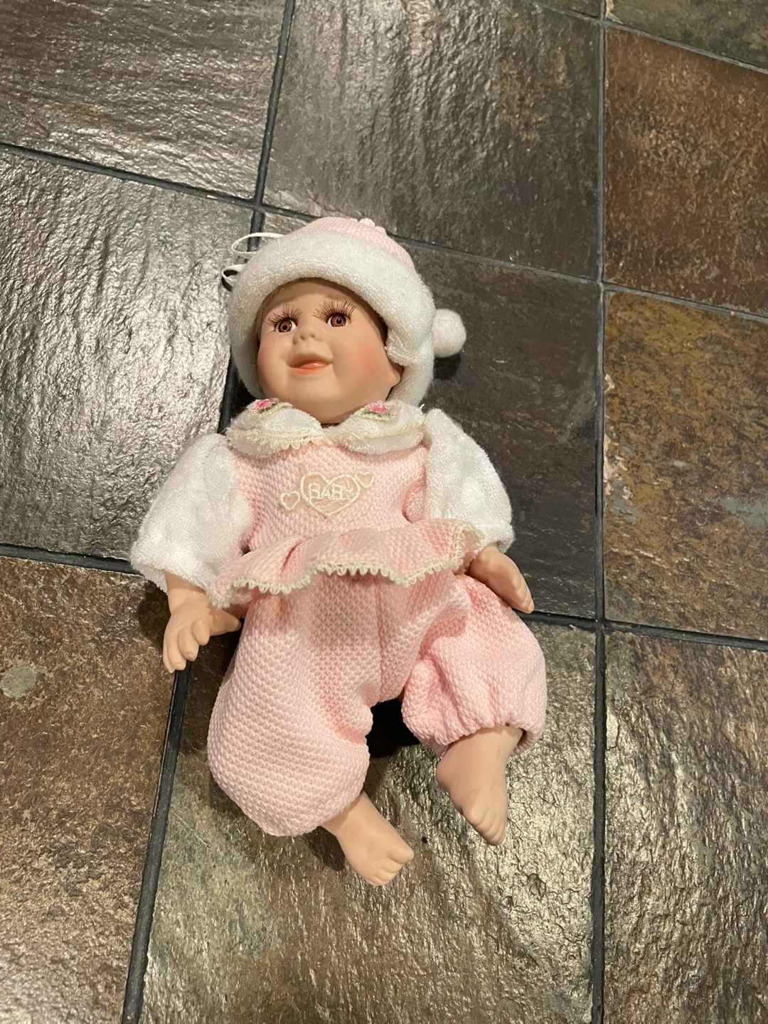 This adorable porcelain baby doll is looking for a new home! She's wearing a sweet pink and white outfit. Perfect for collectors or as a charming decorative piece