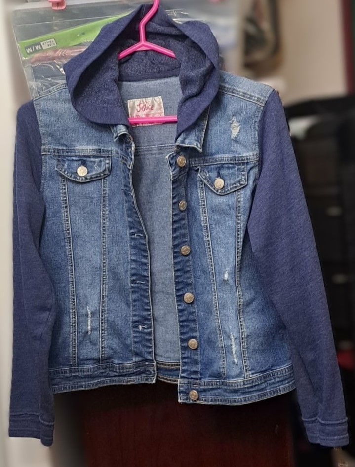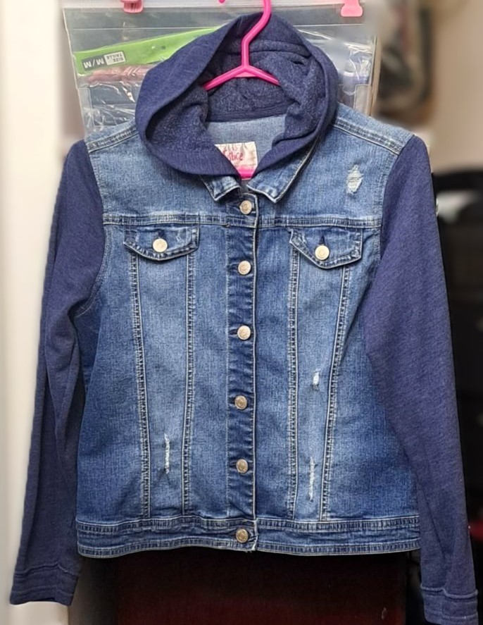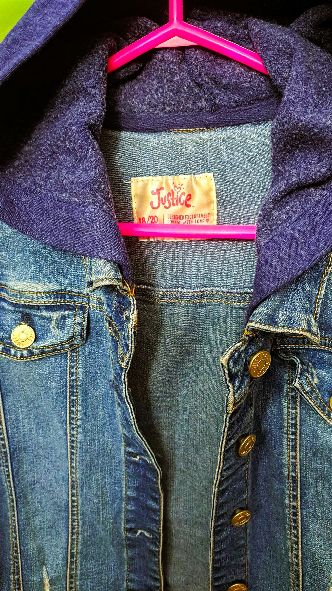 This Justice Denim Hooded Jacket streetwear ripped and distressed denim jacket with vintage-inspired looks. A distressed denim jacket with a ripped design is a timeless staple that provides a contemporary, edgy vibe. Whether thrown over a simple tee or layered with a hoodie, this jacket is sure to make a bold statement. It is in good condition. A youth size 18-20 is approximately a women's size 10 or 12.