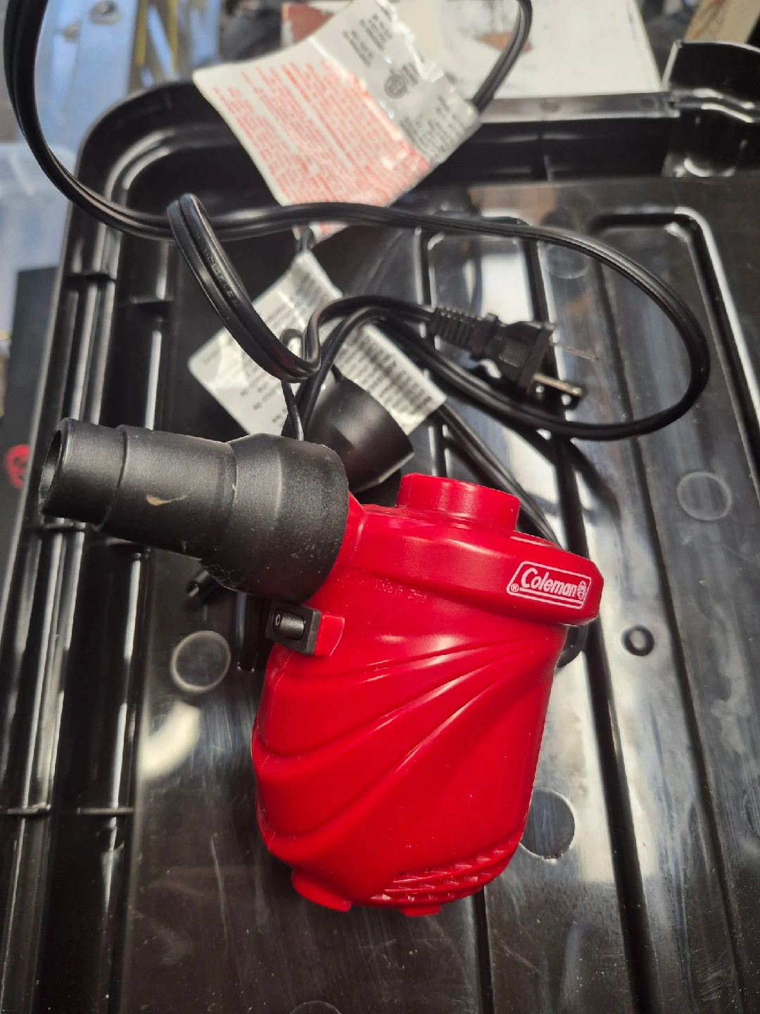 87Selling a Coleman QuickPump 120V Electric Pump in red. It's in great shape and ready to inflate your inflatables quickly and easily