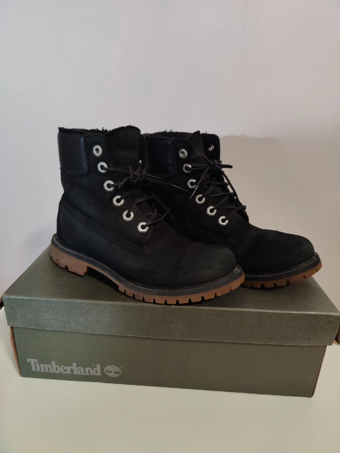 Selling a pair of Timberland boots in black. They are a size 6 and come with the original box. Great for cold winter weather!