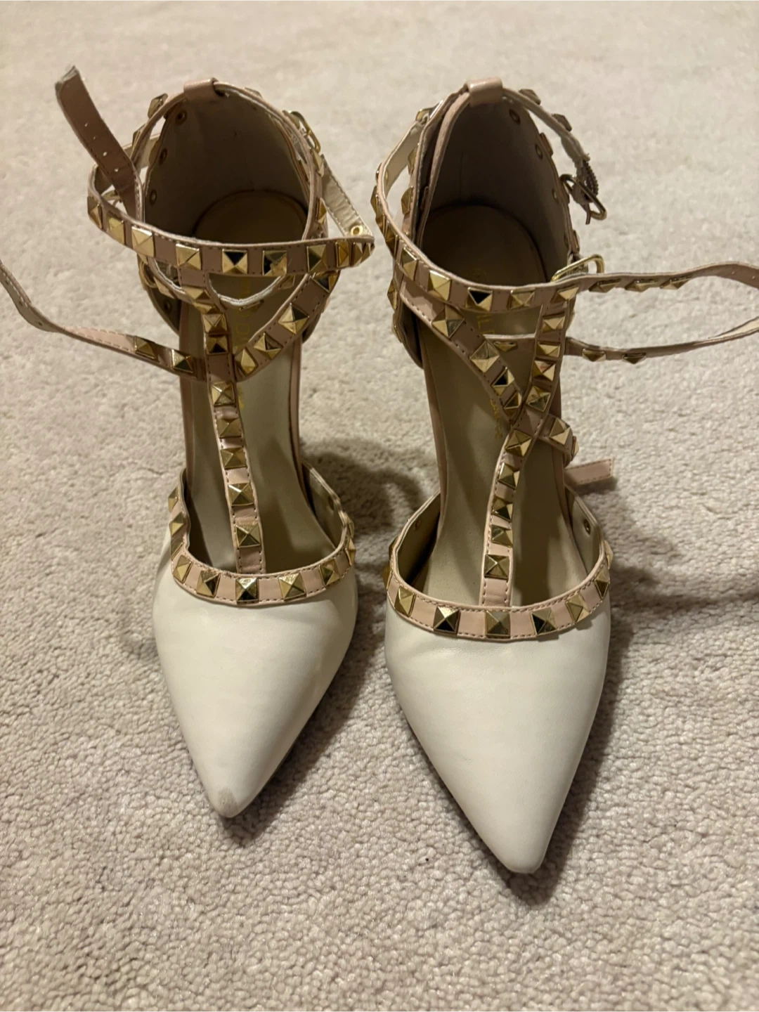 Selling a pair of Wild Diva Lounge heels in size 7. They're a cream colour with gold stud detailing. Please see the photos for condition! Picky from NW Calgary. Cash only.