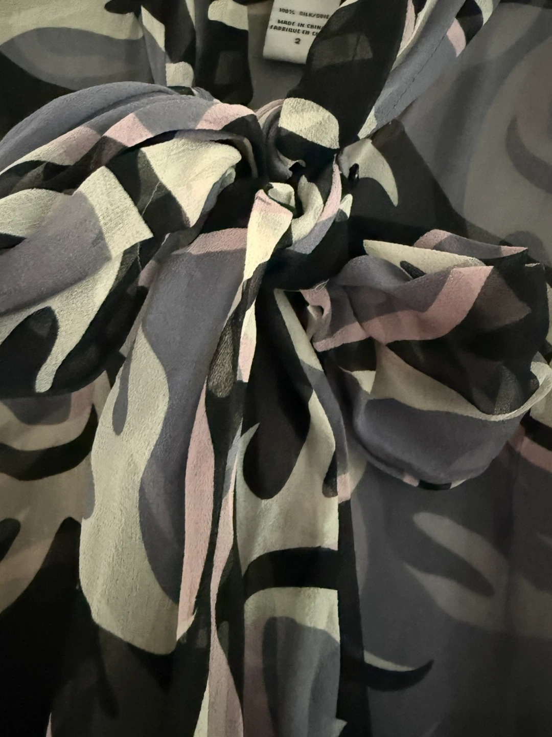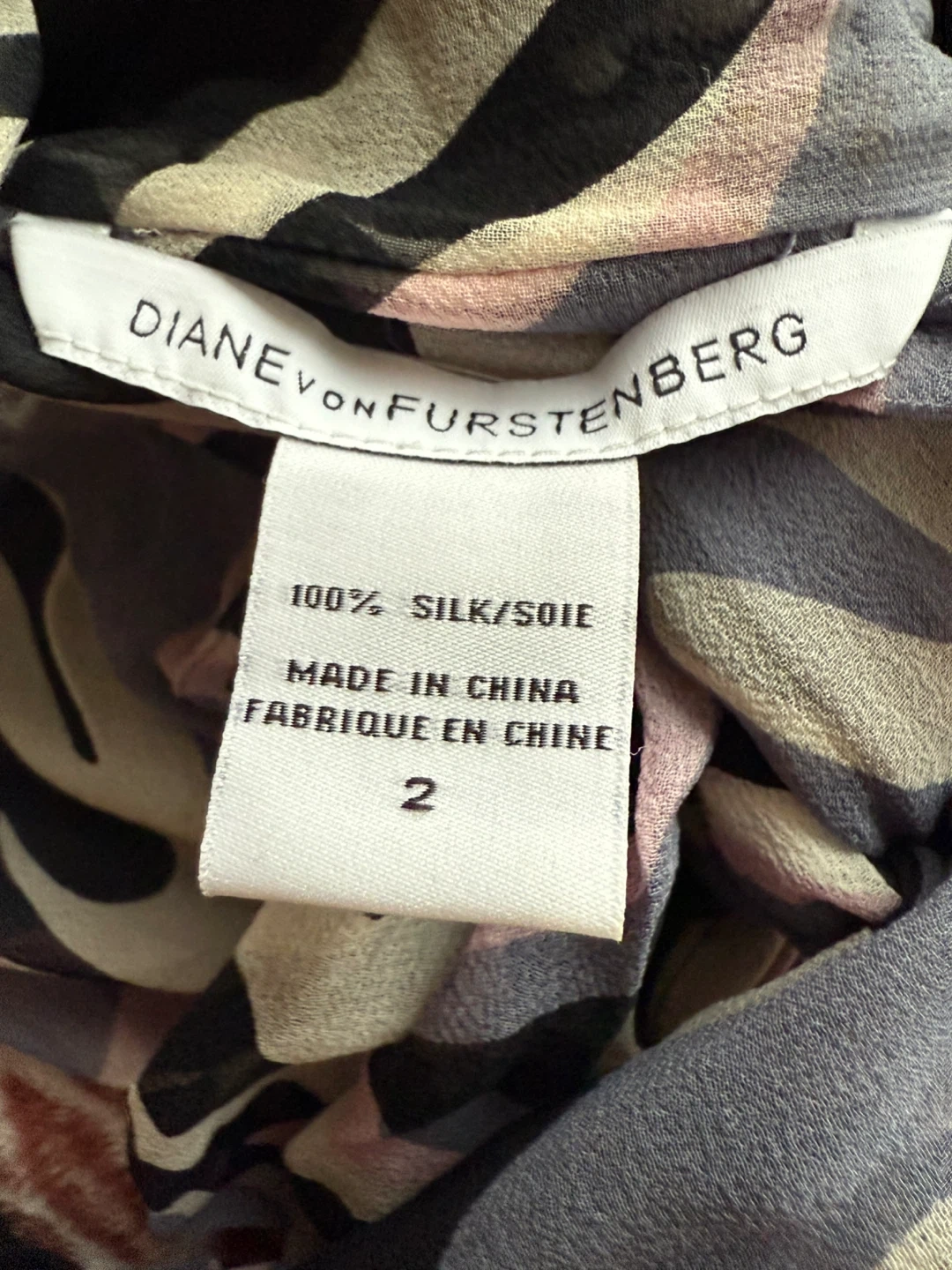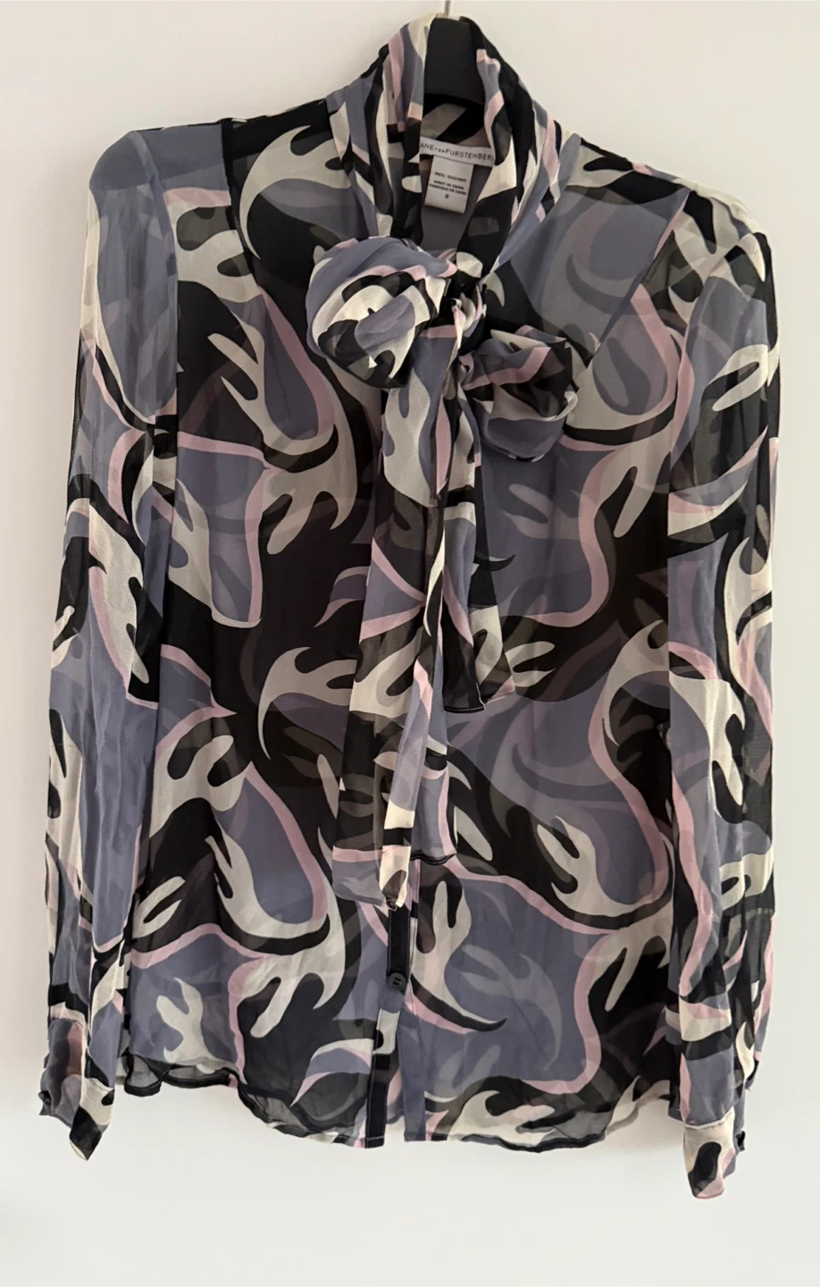 Beautiful Diane von Furstenberg silk blouse with a unique pattern and tie detail. Perfect for adding a touch of elegance to your wardrobe!