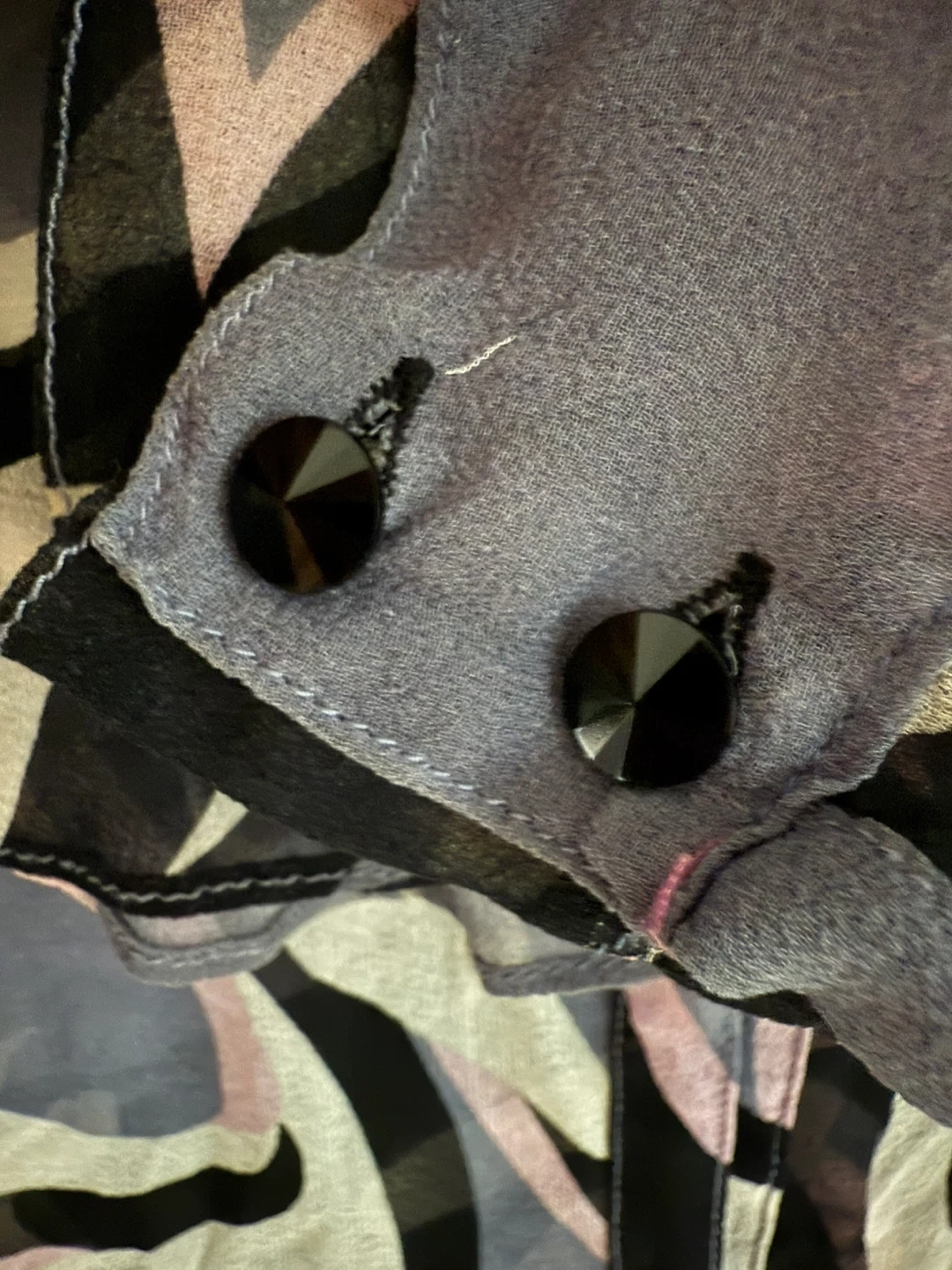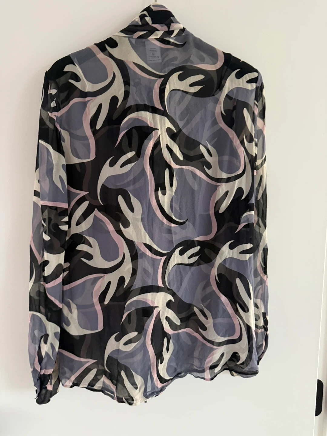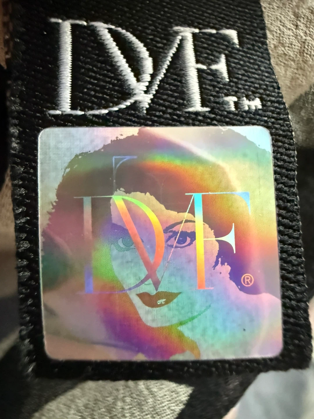 Beautiful Diane von Furstenberg silk blouse with a unique pattern and tie detail. Perfect for adding a touch of elegance to your wardrobe!
