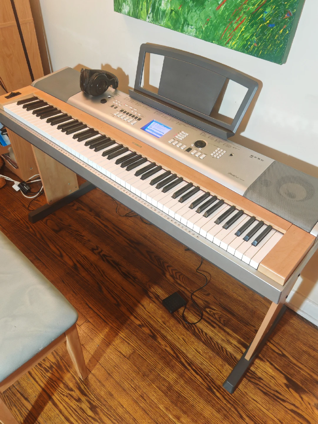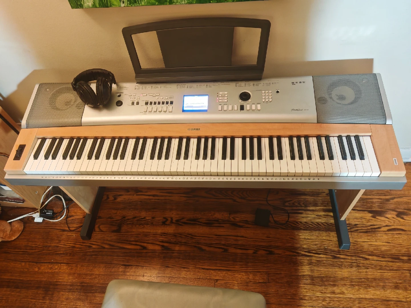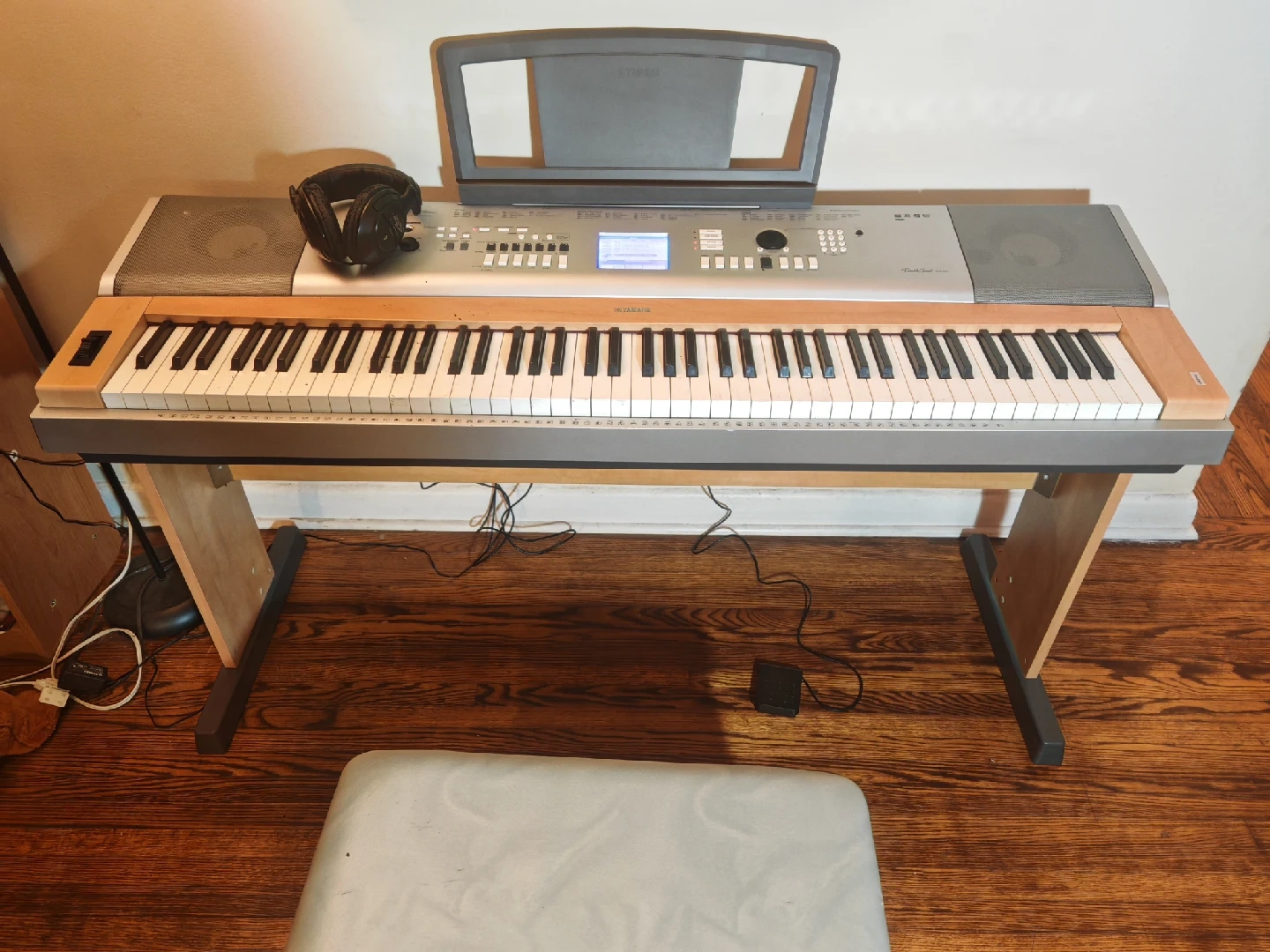 Yamaha Grand Piano keyboard DGX-630 with 88 fully weighted keys in excellent condition. It comes with stand, music rest, sustain pedal, power adapter, headphones and bench.