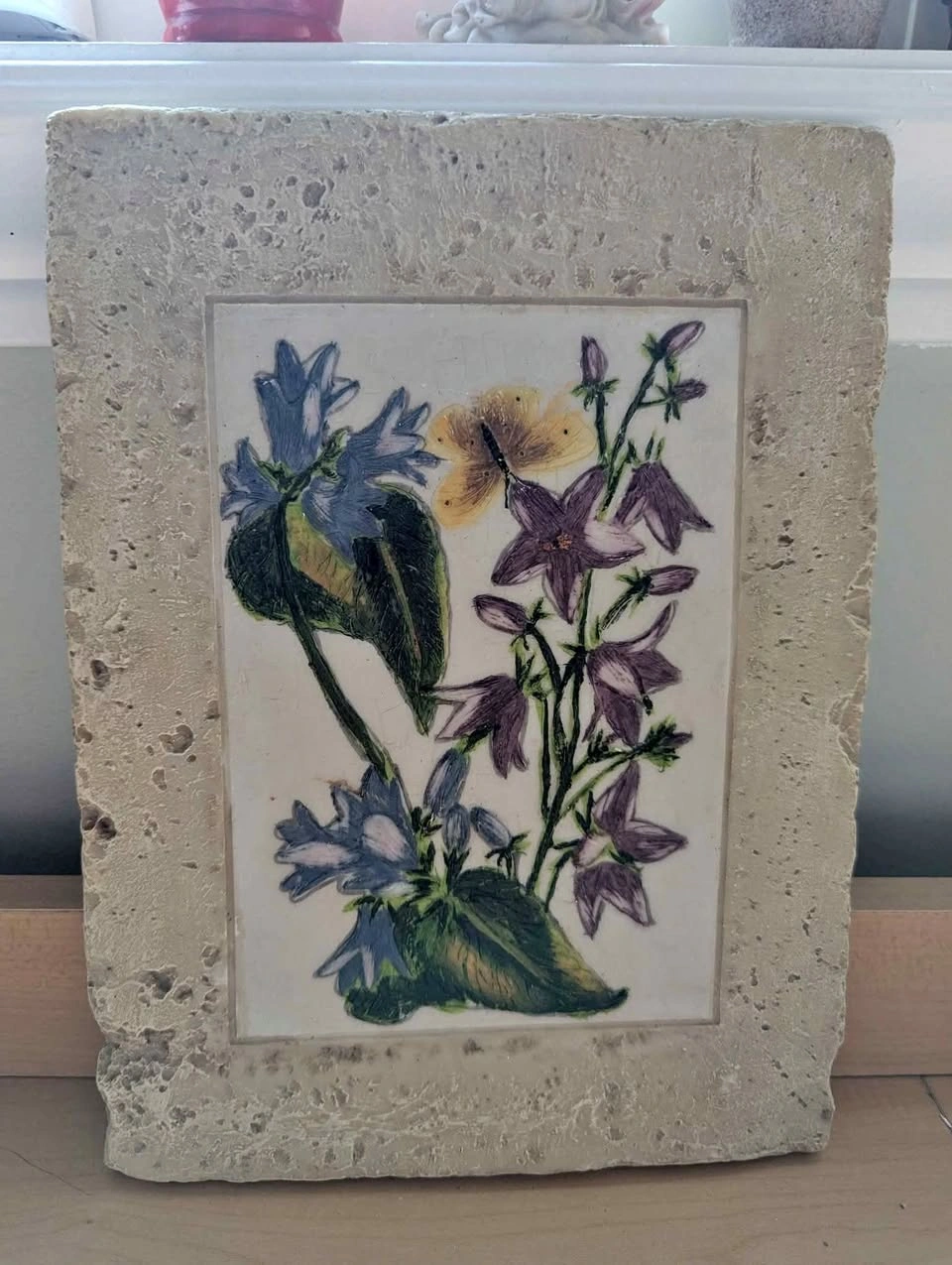 26Vintage blue and purple wall/garden decor with a yellow butterfly from the 1990's. This matches the other plaque posted. It weighs 3 pounds and measures 11" x 8" x 1/2 ". No chips or cracks. Buy both plaques for $5. North St Catharines pickup, cash only