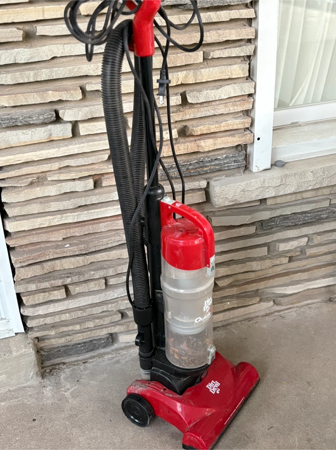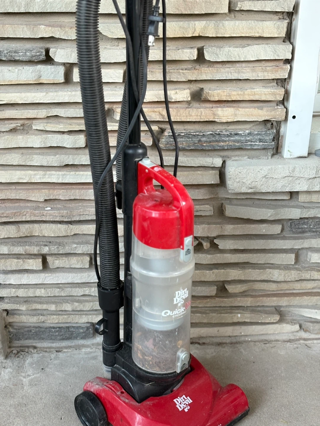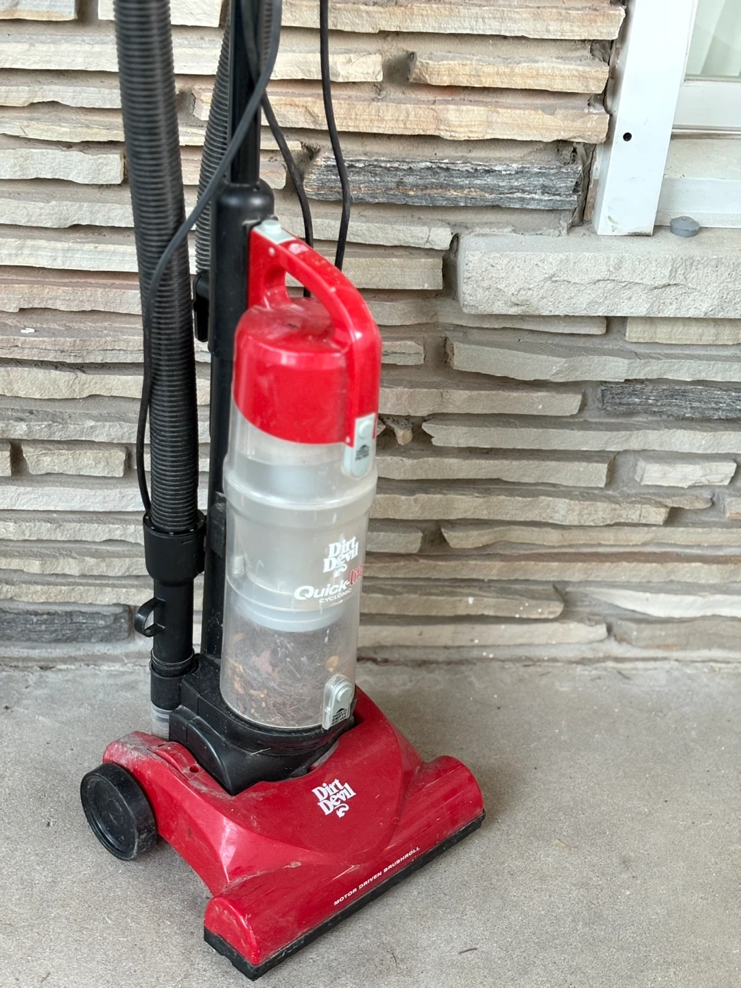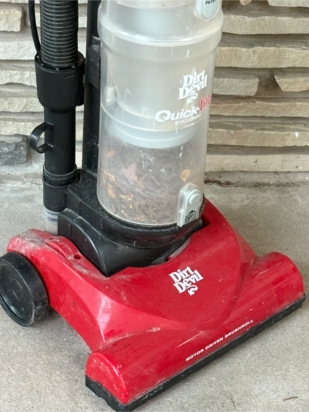 Selling a Dirt Devil Quick-Lite Cyclonic vacuum cleaner. It's red and black and in used condition. It features a motor-driven brushroll for effective cleaning