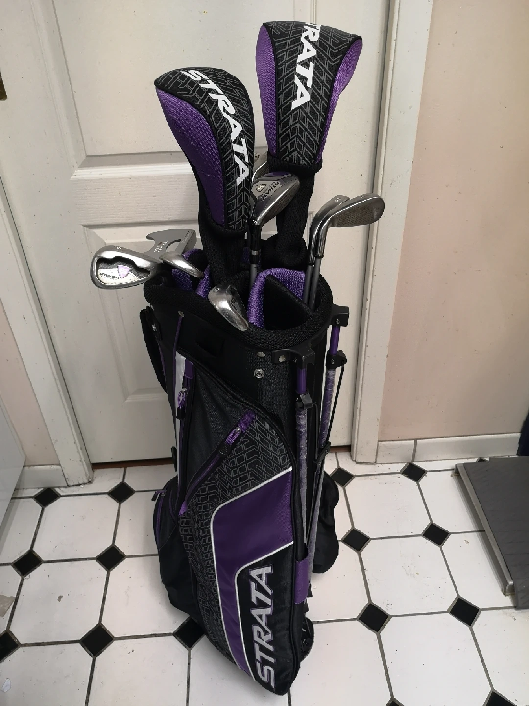 21Selling a Strata golf club set, complete with a bag. The set features a stylish purple and black design. Perfect for hitting the greens! Set consists of: Driver, 3w, 4s hybrid, 6,7,8,9 irons, 58 deg. Wedge, sand wedge, pitching wedge and a putter plus an umbrella.
