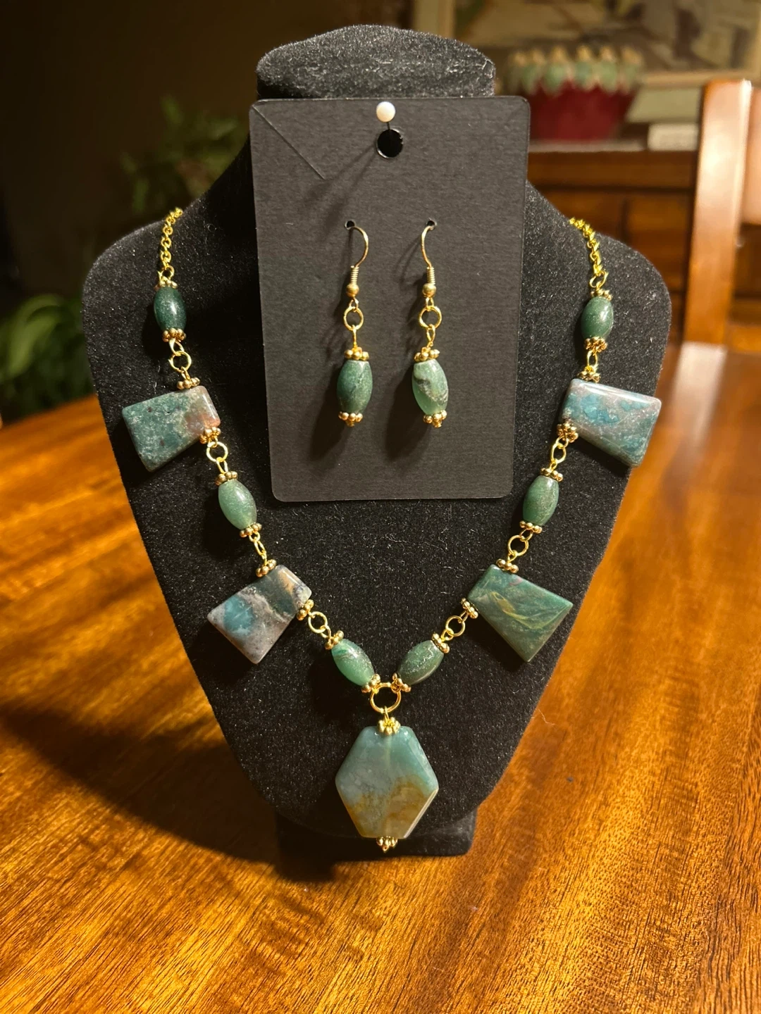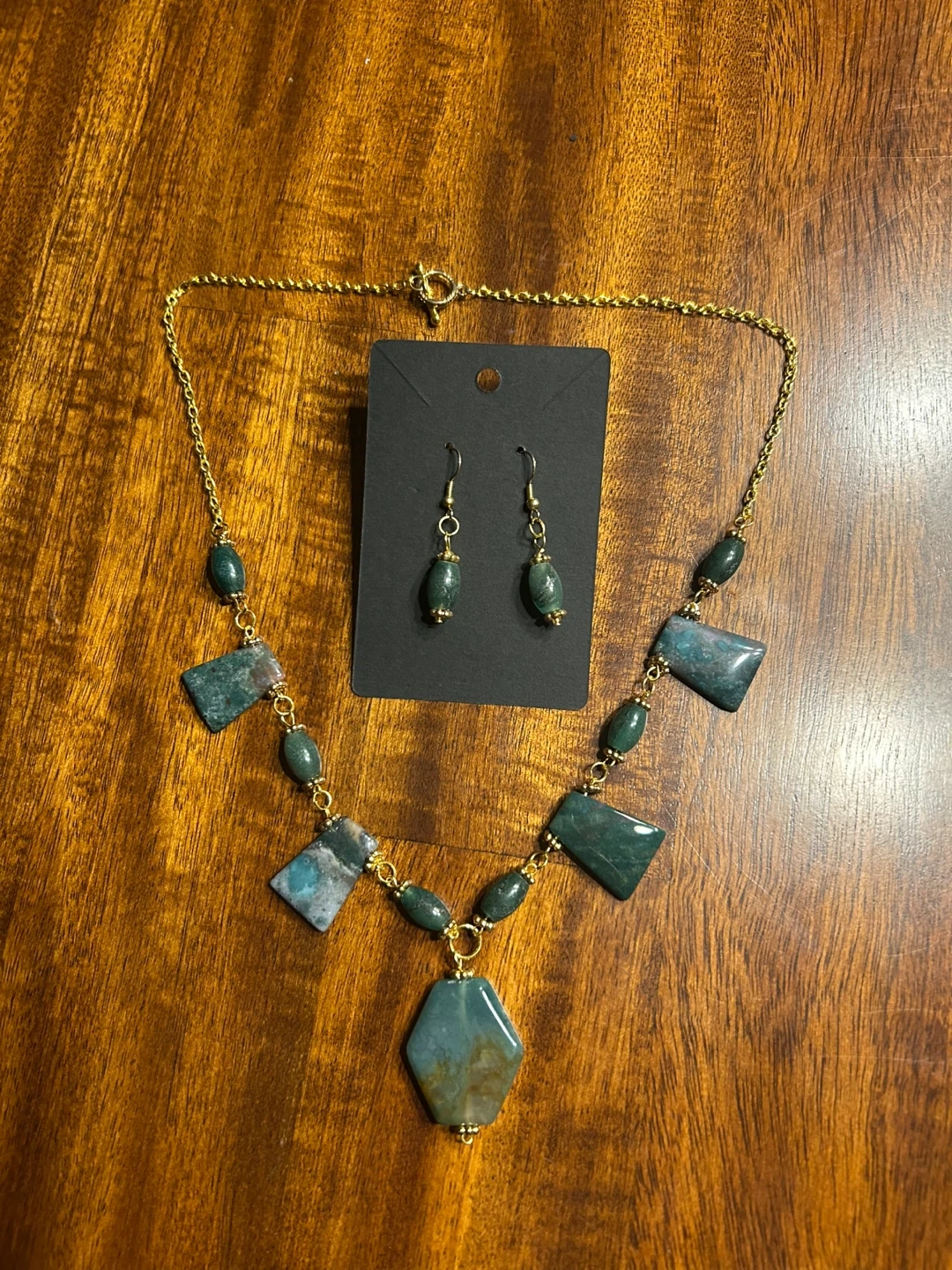 86Beautiful matching necklace and earrings set! The necklace features polished moss green beads connected by a delicate gold-tone chain. Definitely look and feel like polished stone, possibly jasper, agate, or another type of semiprecious stone. The varied earthy tones, natural veining, and subtle translucency on the trapezoid beads are all natural indicators. The earrings have a similar green stone bead design. The beads are cool to the touch, have natural weight, and make a clear “clink” when tapped—indicating real stone or glass rather than resin or plastic. Slight possibility of glass beads that resemble natural stone but I’m almost positive they are stone. This set would be a lovely addition to any jewellery collection! Set is in great condition! 💵 Bundle with any of my other listings for a great discount! 🤝 Easy public pickup in Fort Erie. 📦 Spend $75+ (including bundled) and I can meet within the Niagara region for delivery. 💰 Cash or E-transfer accepted.
