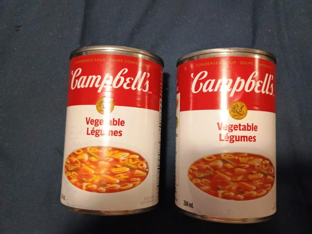 two sealed cans of Campbell's Vegetable Soup. Each can contains 284 mL of soup