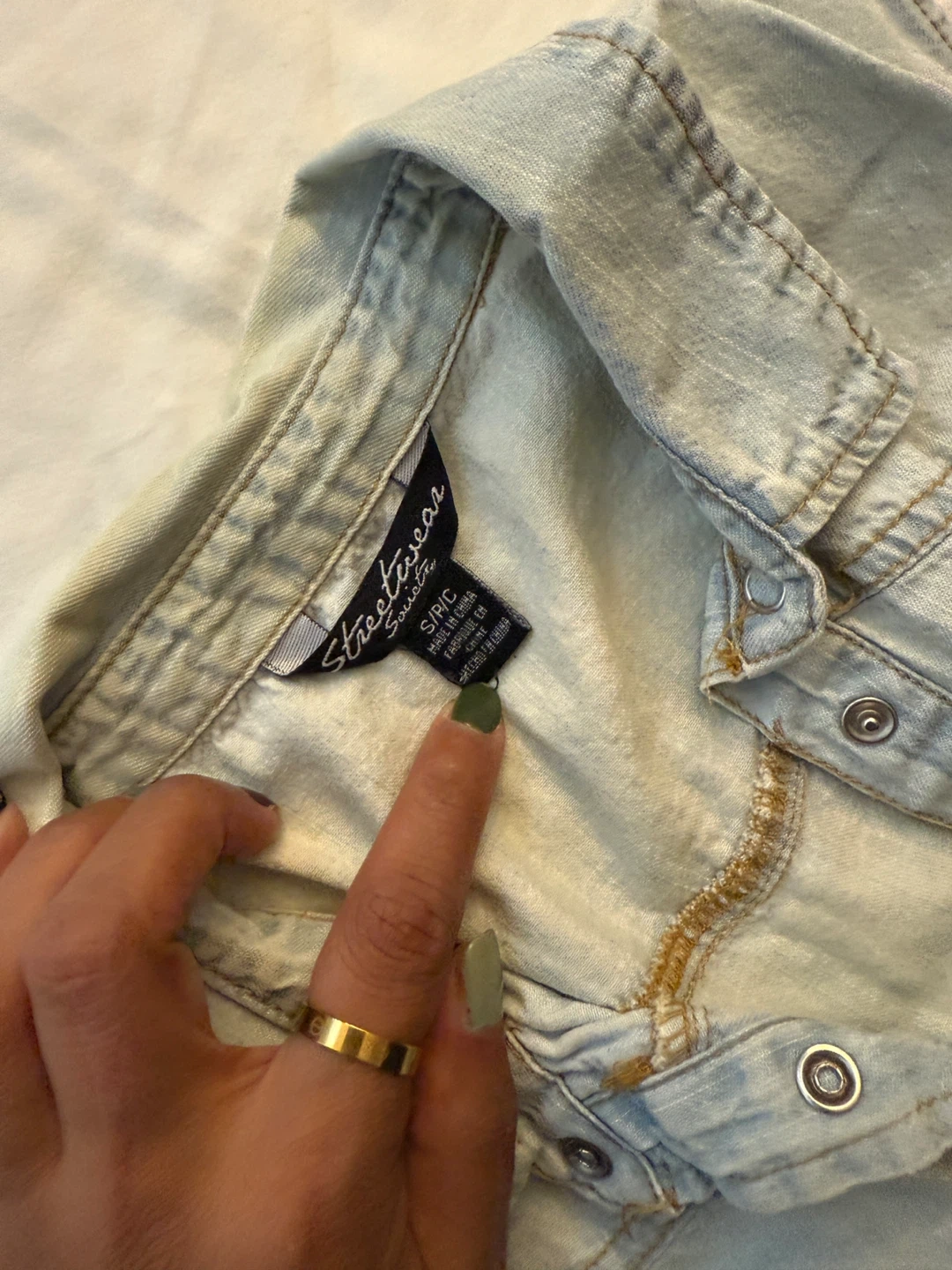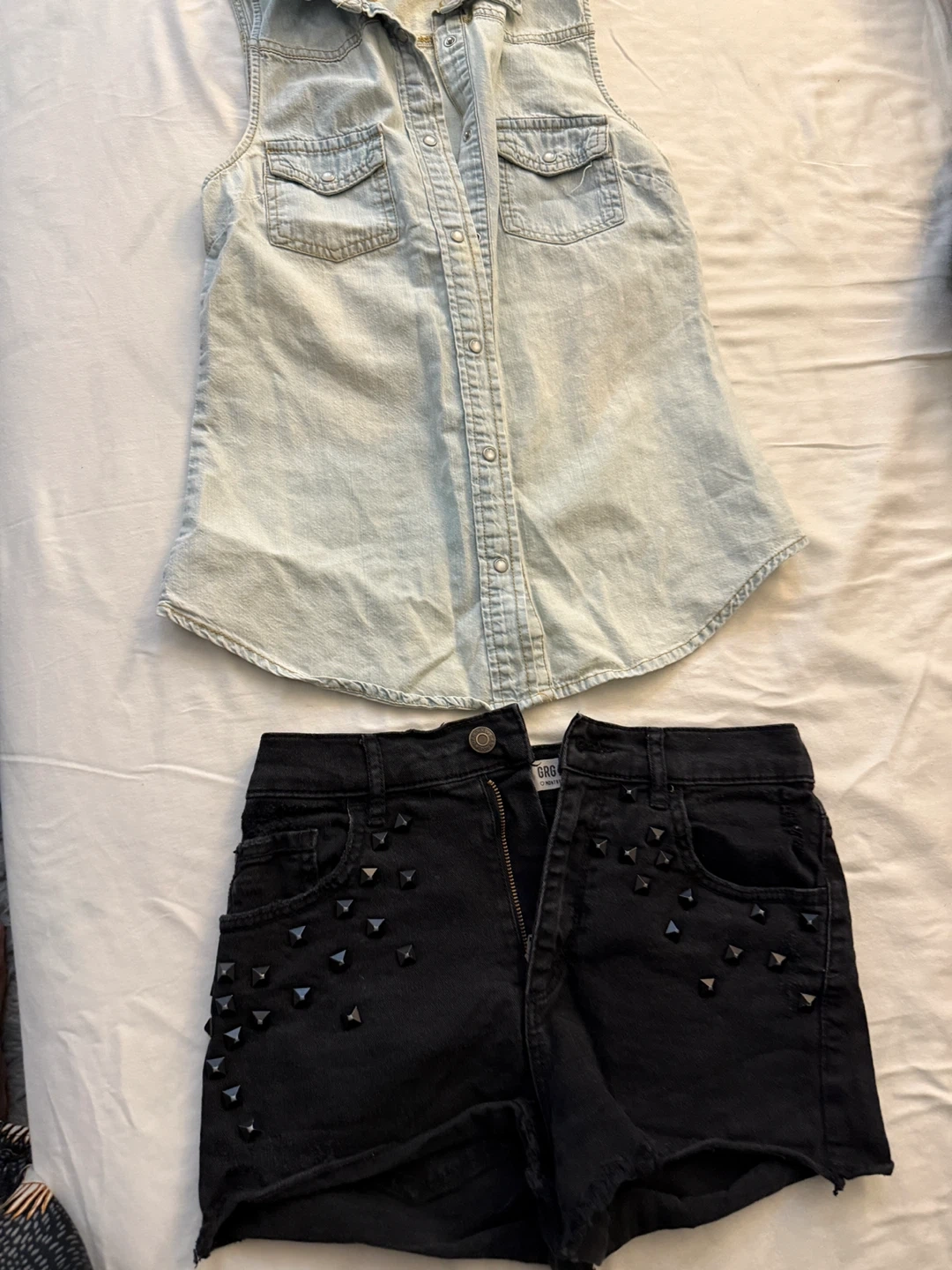 Selling a cute combo! A light wash denim top from Streetwear Society and black studded shorts from GRG DNM Montreal. Both items are a size small and in great condition!