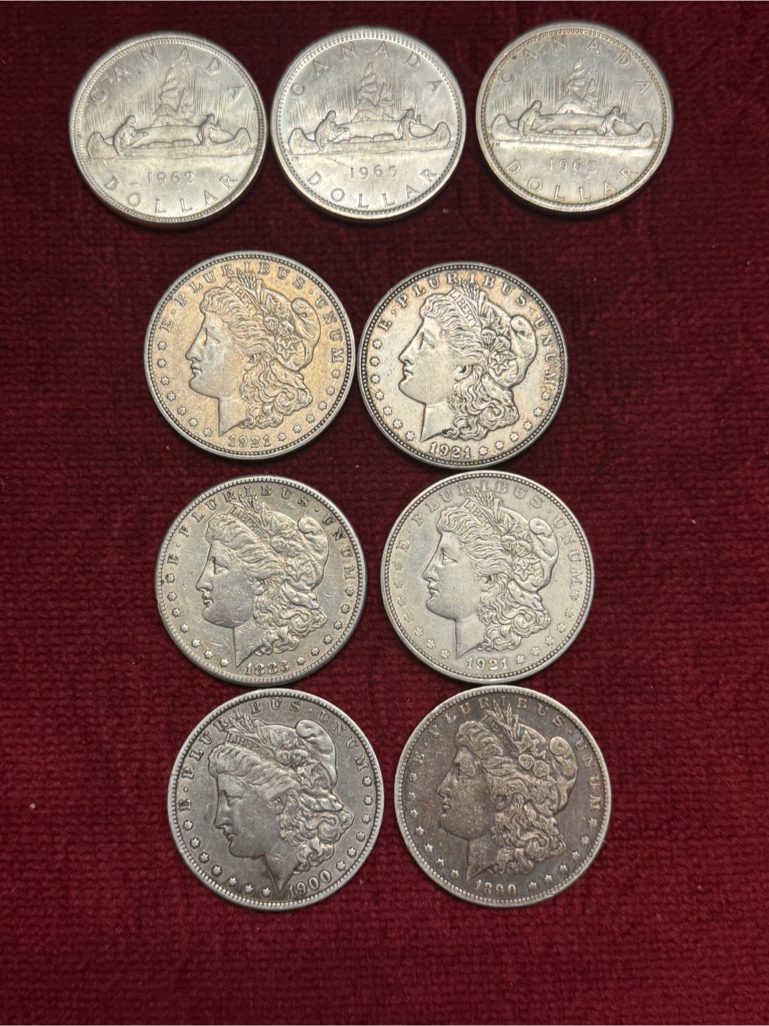 Selling a collection of vintage silver coins. Includes Canadian silver dollars from 1962 and 1965, and US Morgan silver dollars from the early 1900s. A neat addition to any coin collection!