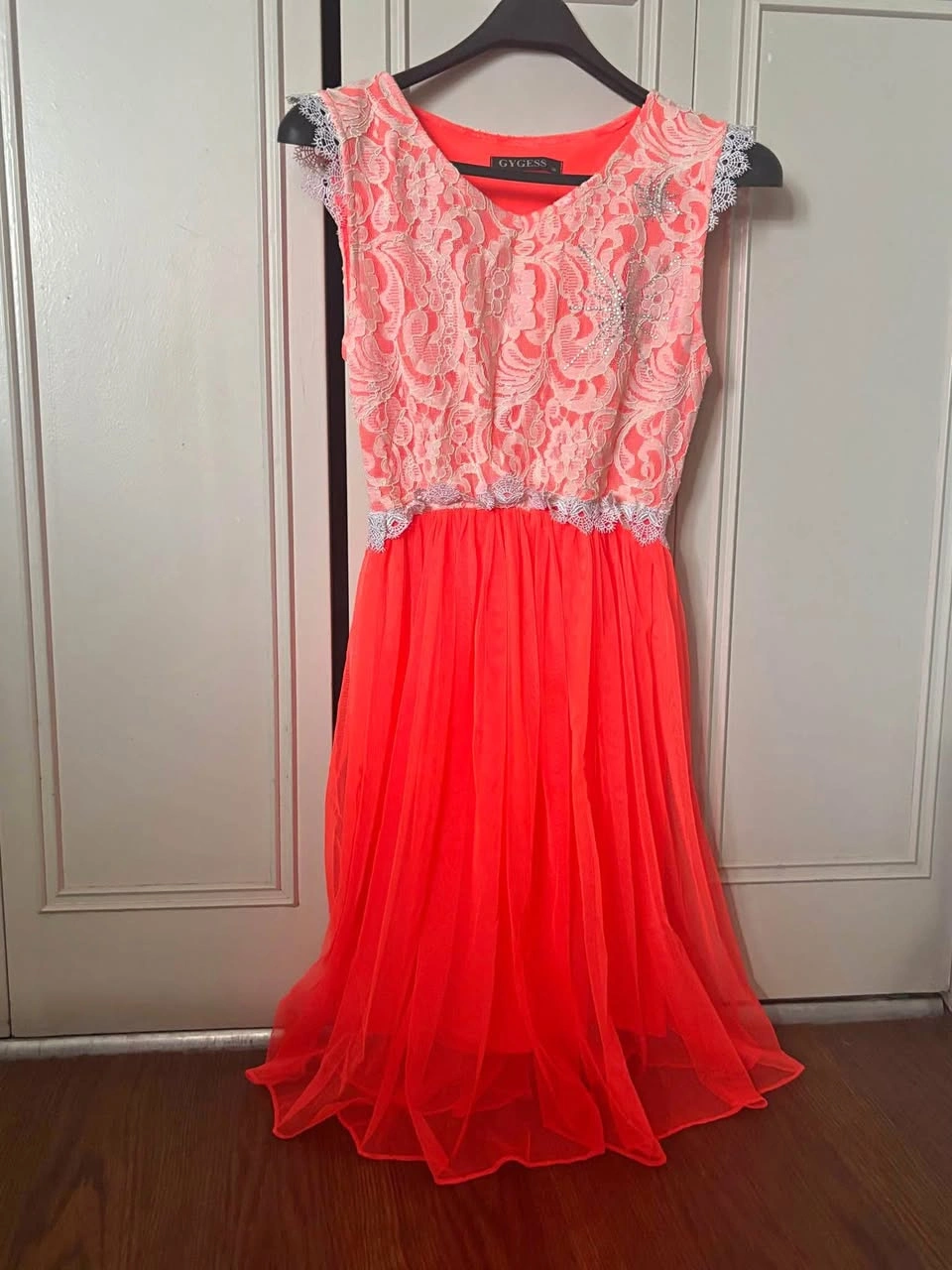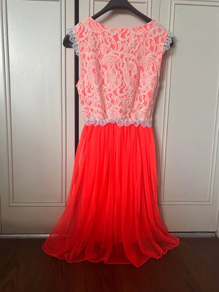 65Bright orange dress perfect for parties. As a bonus, neon earrings for free. Size S.