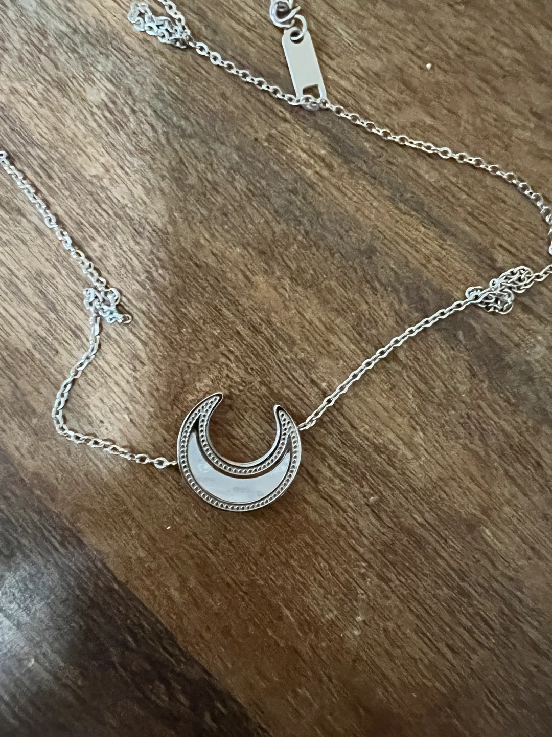 Brand new silver and mother of pearl crescent moon necklace. Won’t tarnish or cause an allergic reaction.