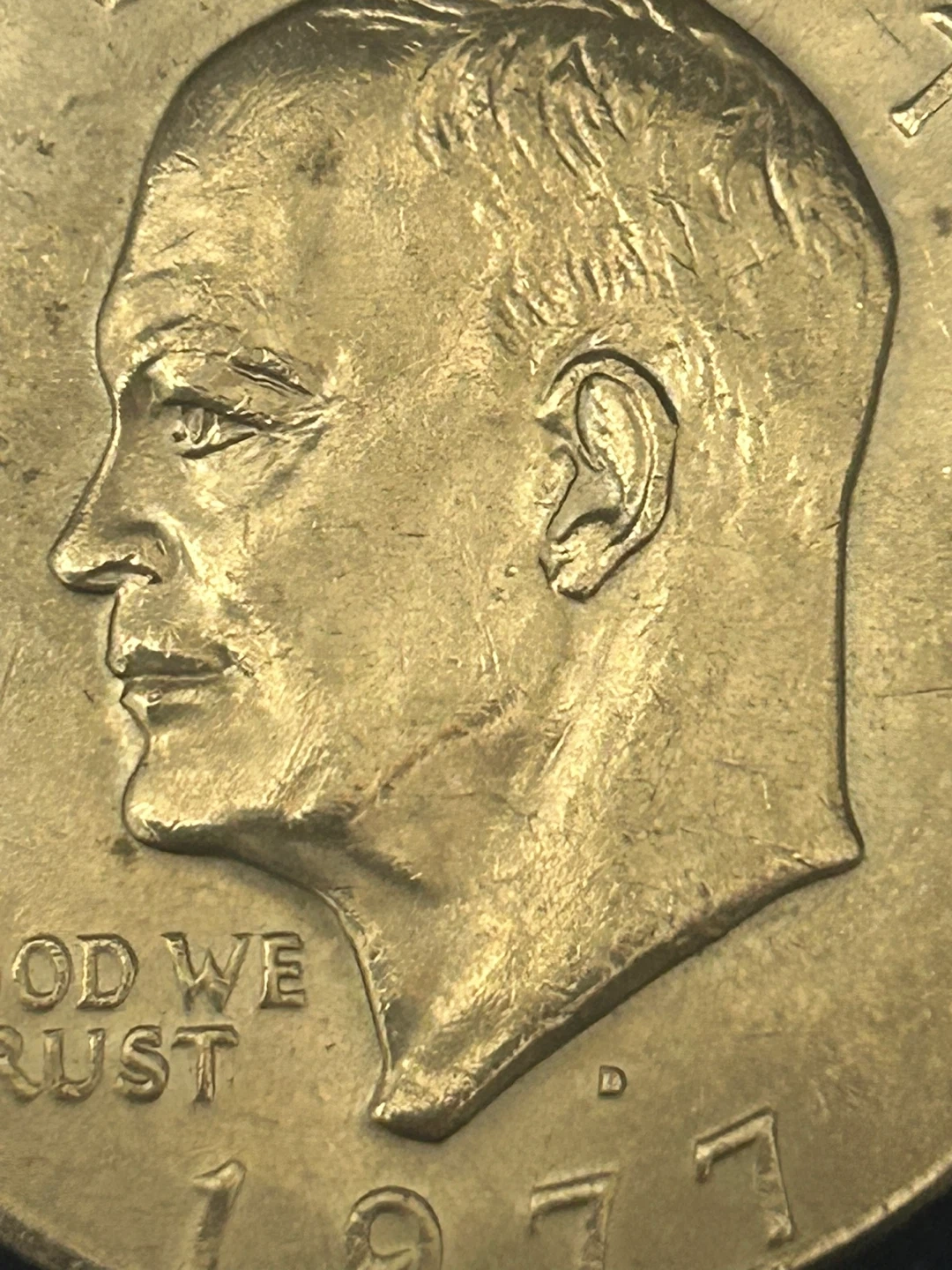 Selling a circulated 1978 D Eisenhower Dollar Coin. This coin is made of clad composition and was minted in Denver. It's a business strike coin that features the image of President Dwight D. Eisenhower on one side and the Great Seal of the United States on the other. It's an uncertified and ungraded coin, making it a valuable piece of American numismatic history from the late 1970s with an off-center strike notice the one in picture that has the d this is a extremely rare coin to find . See picture for more info