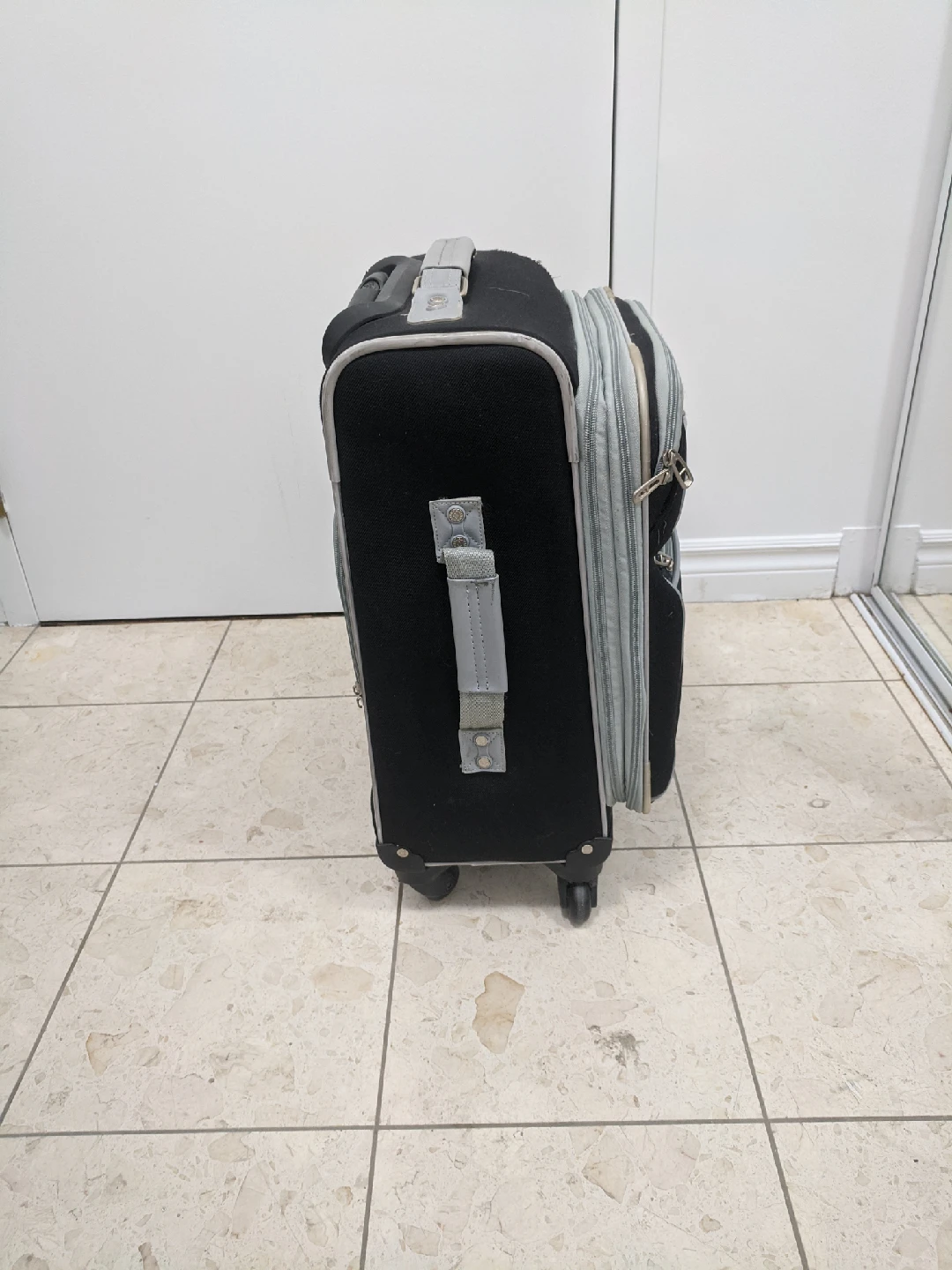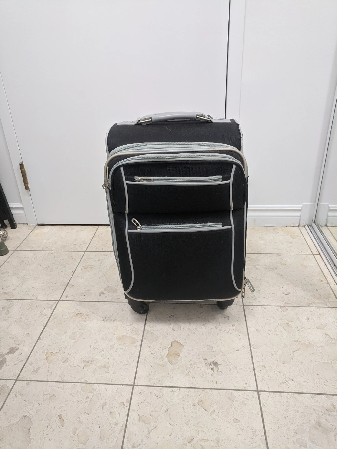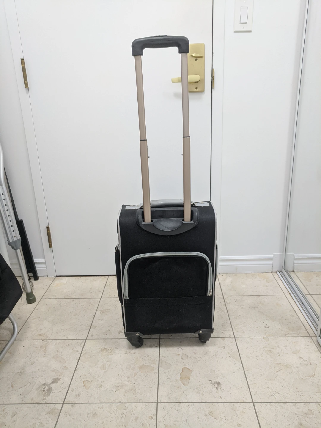 Selling a black carry-on suitcase. It's in good condition and ready for your next trip! The suitcase has a retractable handle and wheels for easy maneuvering. used but it in good condition. very strong but a little heavy (4kg). size: 13"x10"x22"(including wheel)