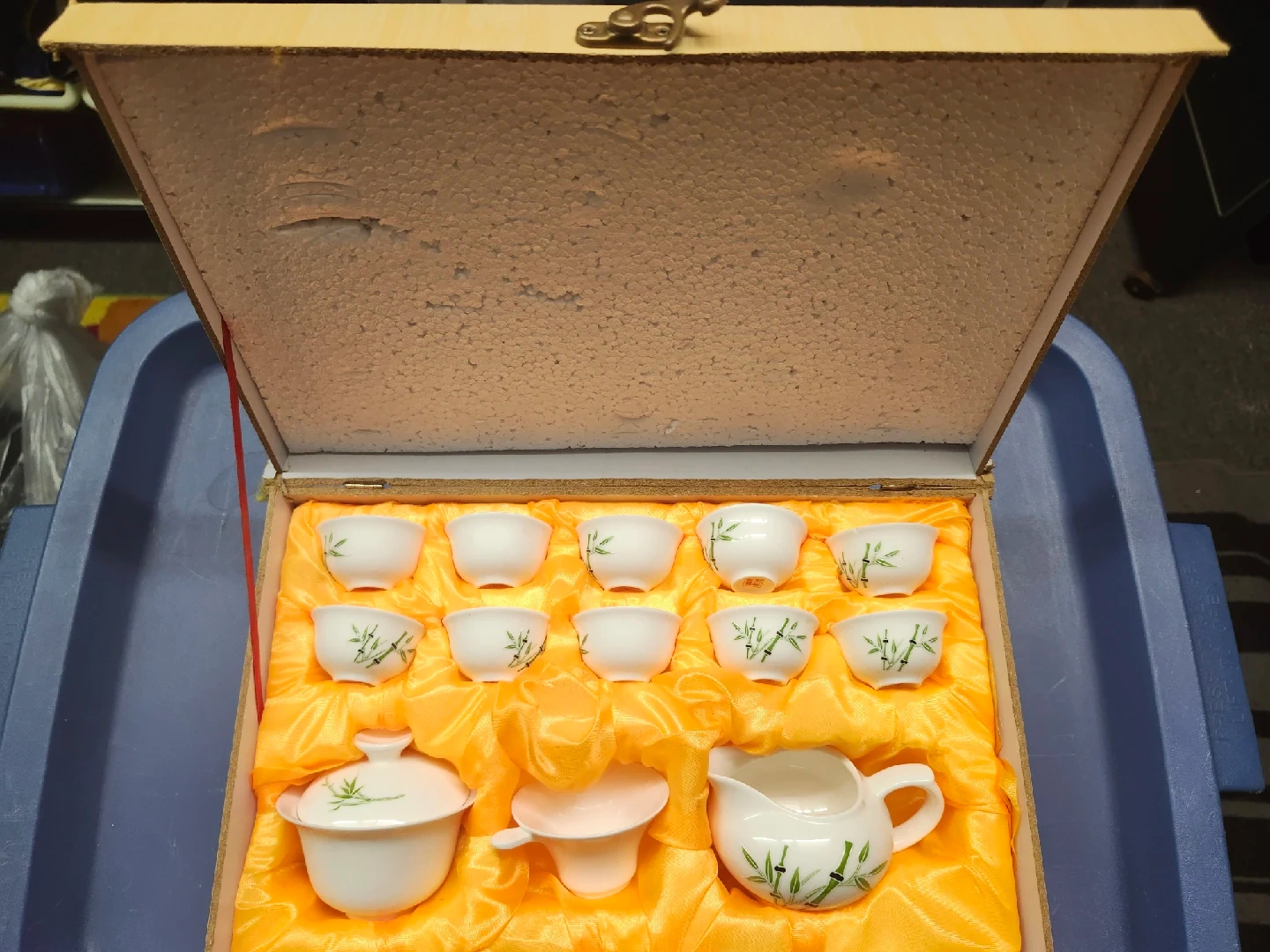 1000+This lovely tea set comes in wooden box. The set includes several small teacups, a tea pitcher, and a lidded serving dish, all adorned with a delicate bamboo design. It would be a great addition to any tea lover's collection!
