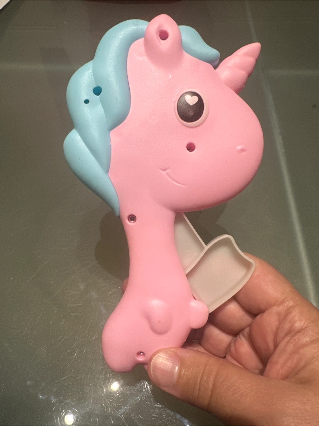 A cute handheld fan in the shape of a pink and blue unicorn! It's lightweight and portable, perfect for keeping cool on the go