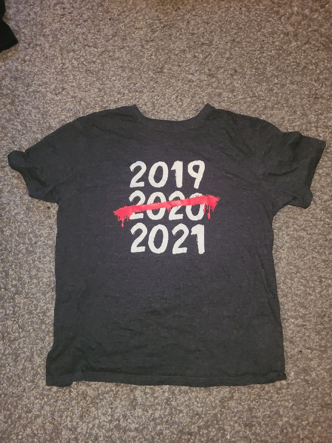 10Here's a grey t-shirt with the years 2019, 2020 (crossed out), and 2021 printed on it! It's in good condition and ready for a new home. It's 60% cotton