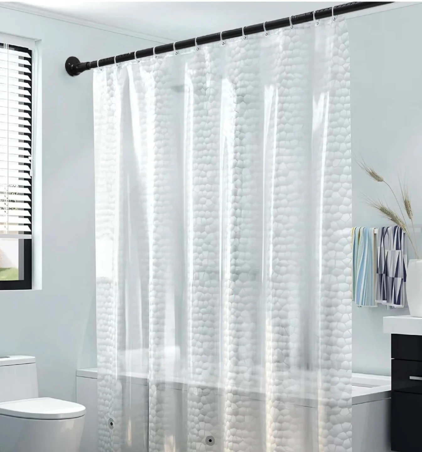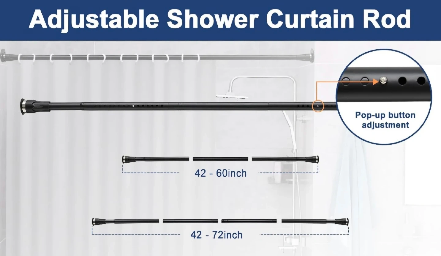 70This heavy-duty adjustable shower curtain rod is perfect for any bathroom! It features a pop-up button adjustment for easy length customization. New. 42 to 72 inches. Can also be used as closet rods, curtain rod, room dividers, window lock bars, sliding door safety bars and more.