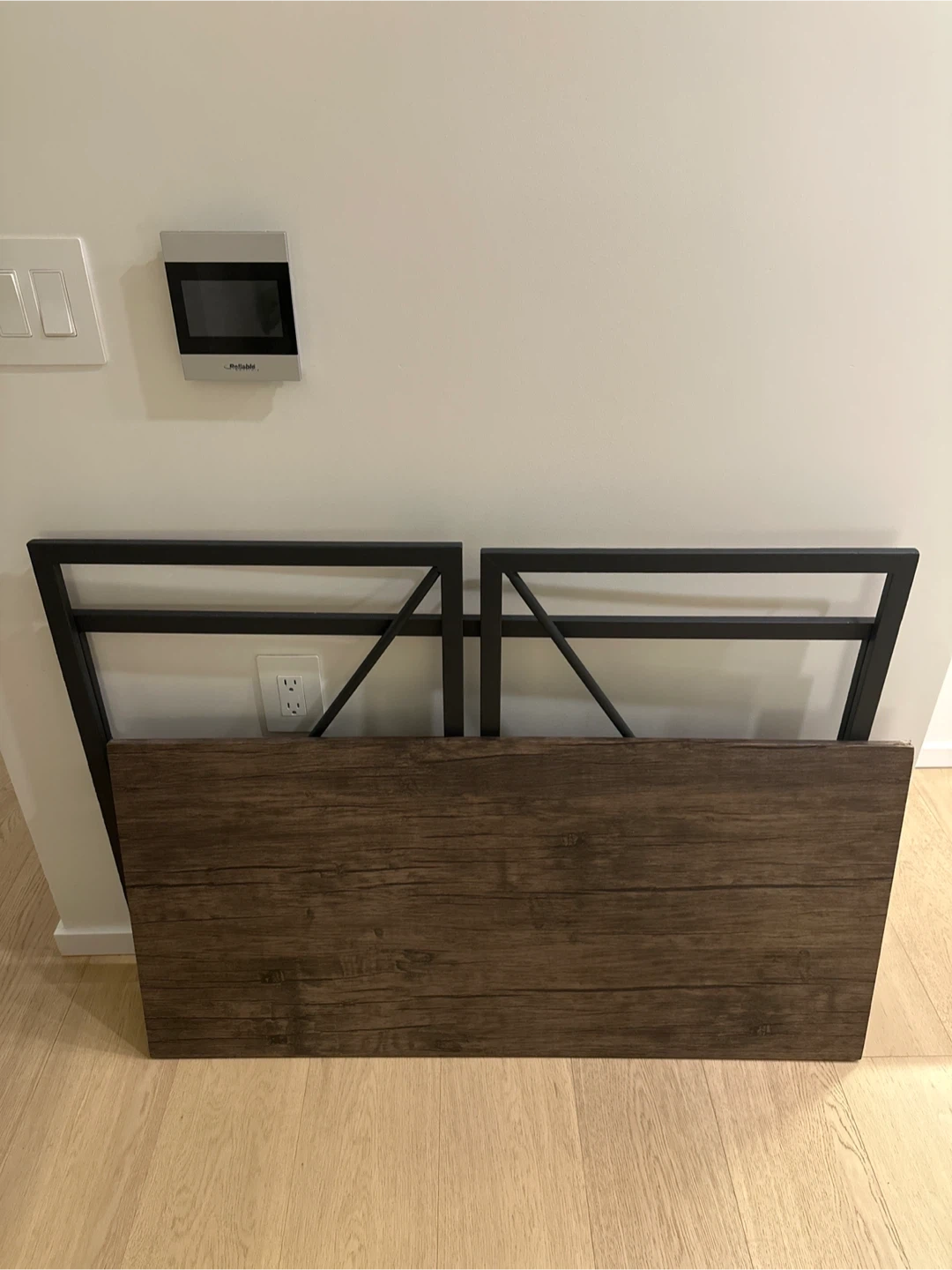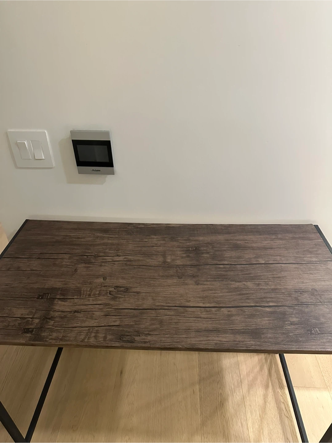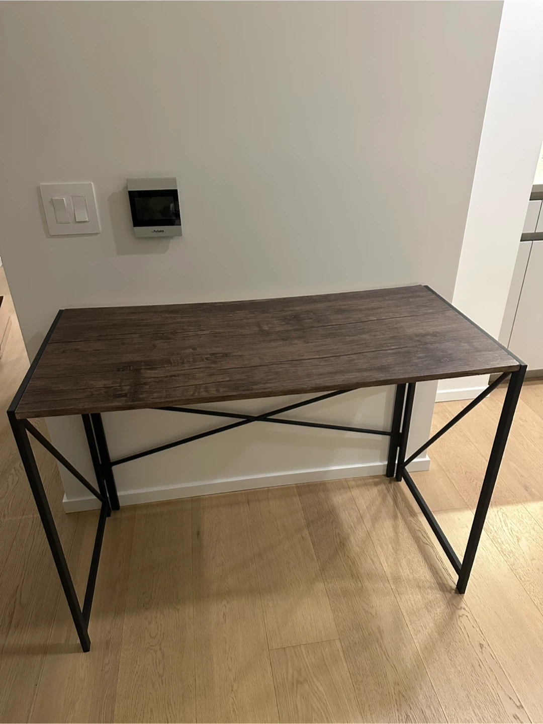 Selling a folding desk with a brown wood top and a black metal frame.