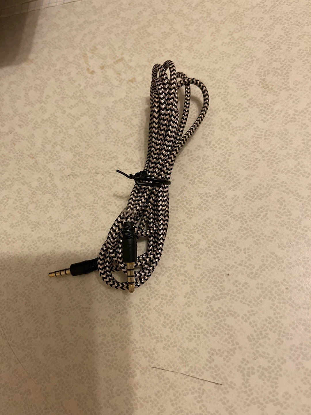 20Selling an auxiliary cable with a braided black and white design. It appears to be in good condition and ready for a new home!