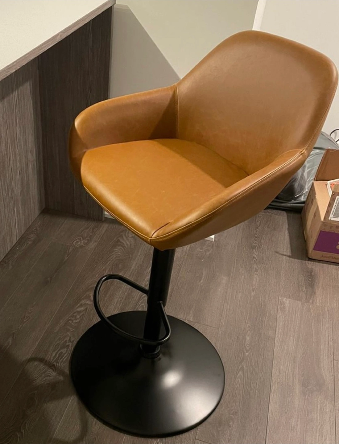 10Distinctly Home James Faux Leather Hydraulic Bar Stool Selling a stylish bar stool with a tan faux leather seat and a black base. It's in excellent condition and would look great in any kitchen or bar area!