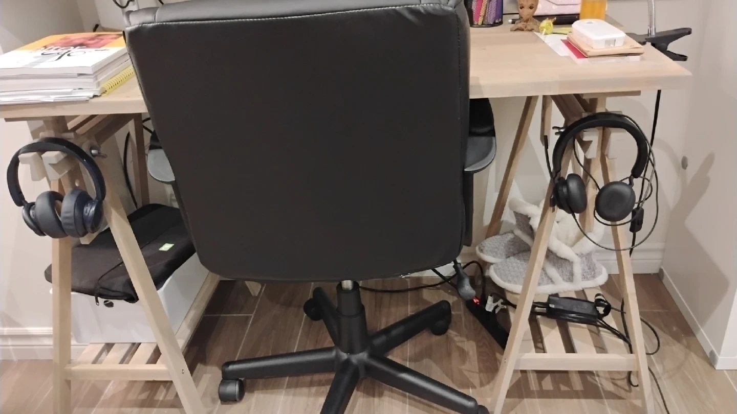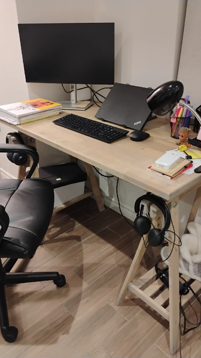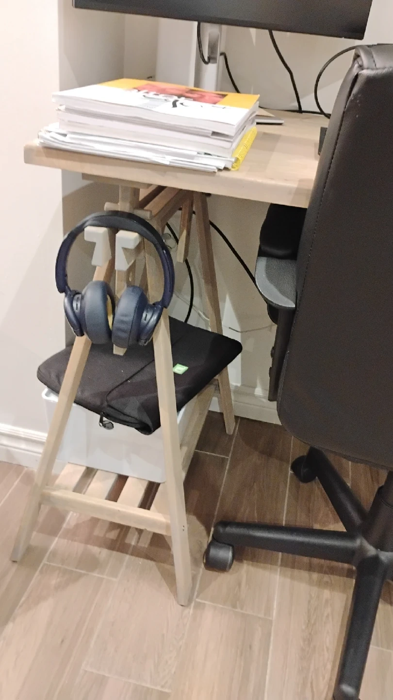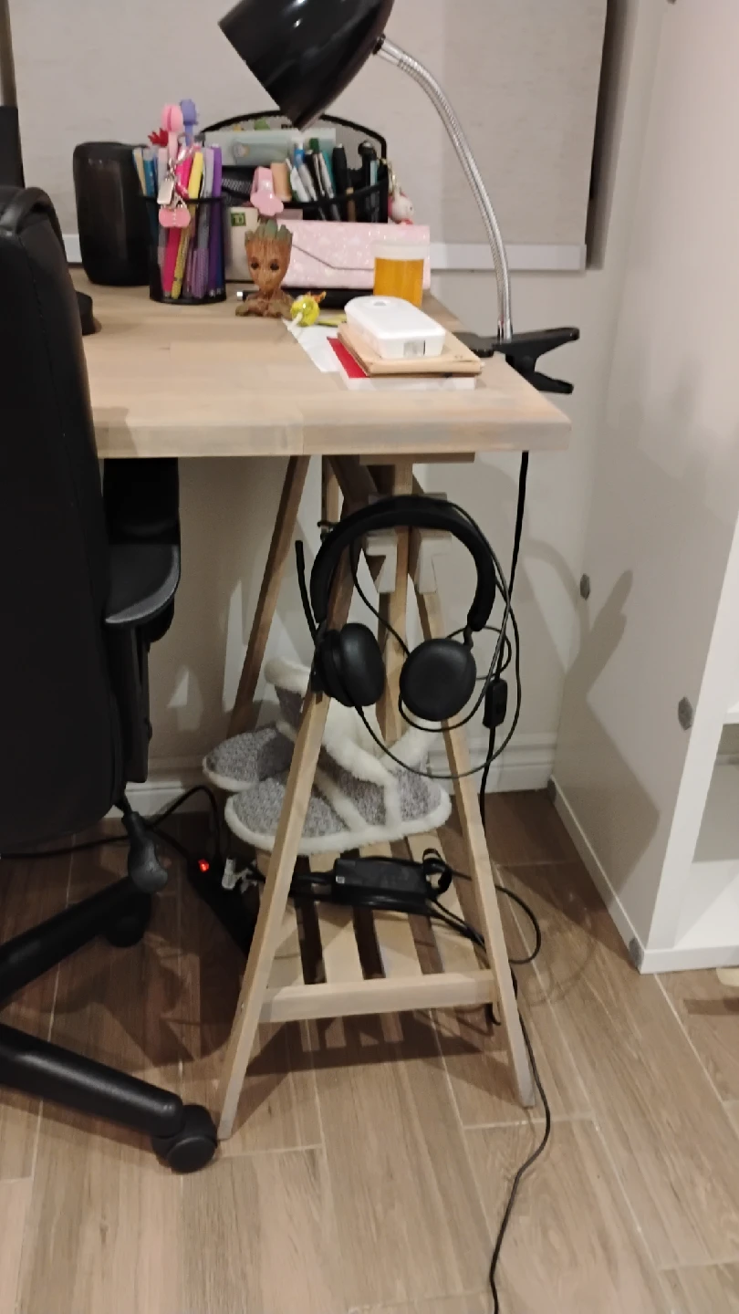 Selling a trestle desk with adjustable height. It's in great condition and perfect for a home office or study space. The light wood finish complements any decor and the sturdy construction ensures a stable work surface