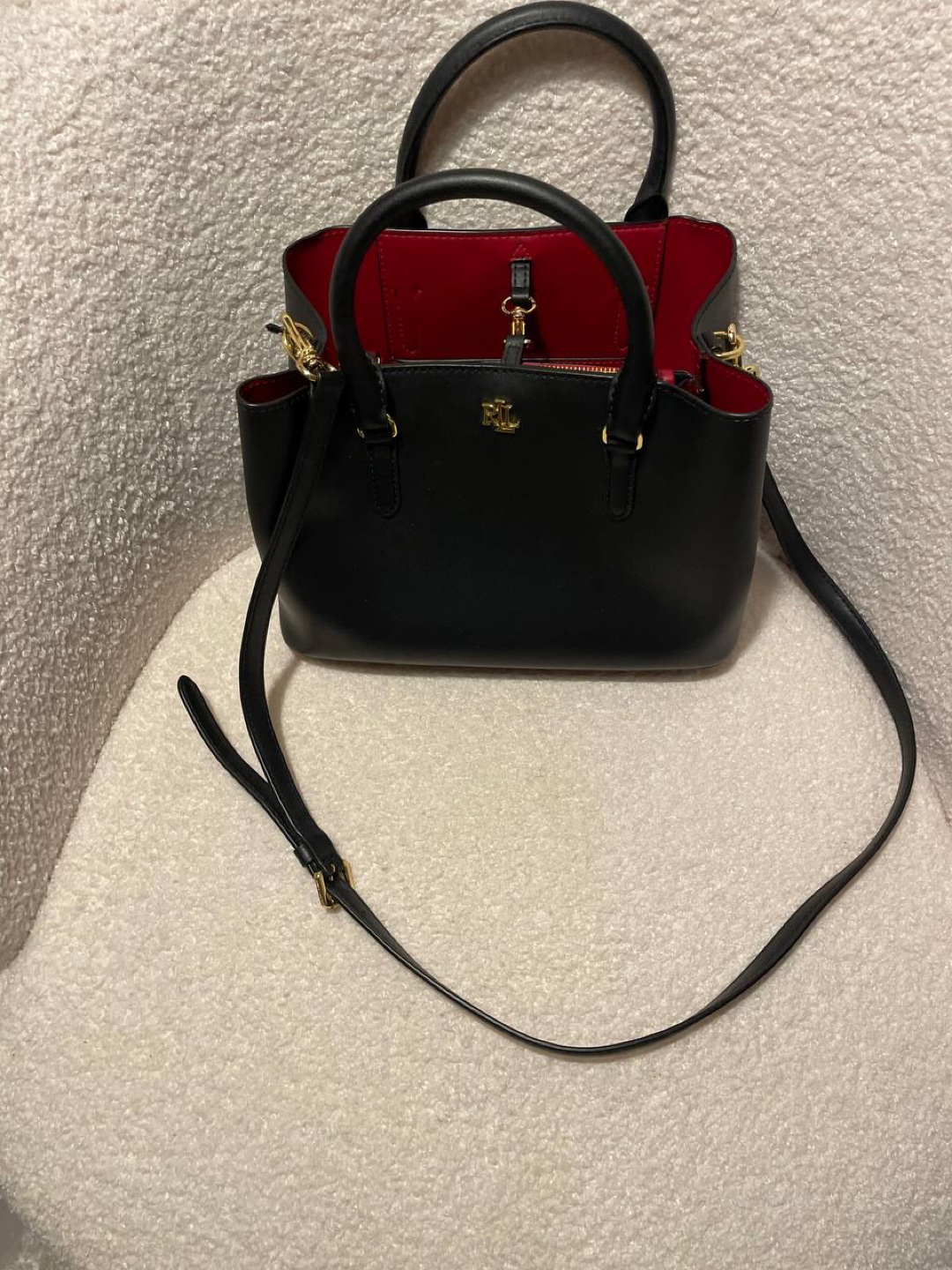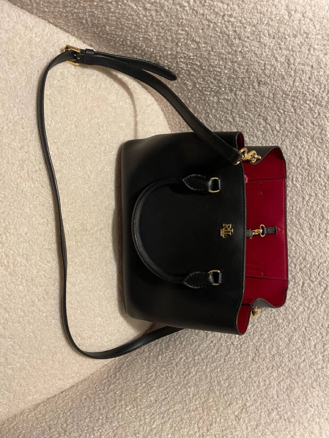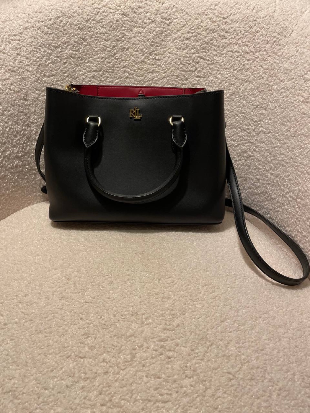 This is a stylish black Ralph Lauren satchel. It's made of leather with a vibrant red interior. Perfect for adding a touch of elegance to any outfit!