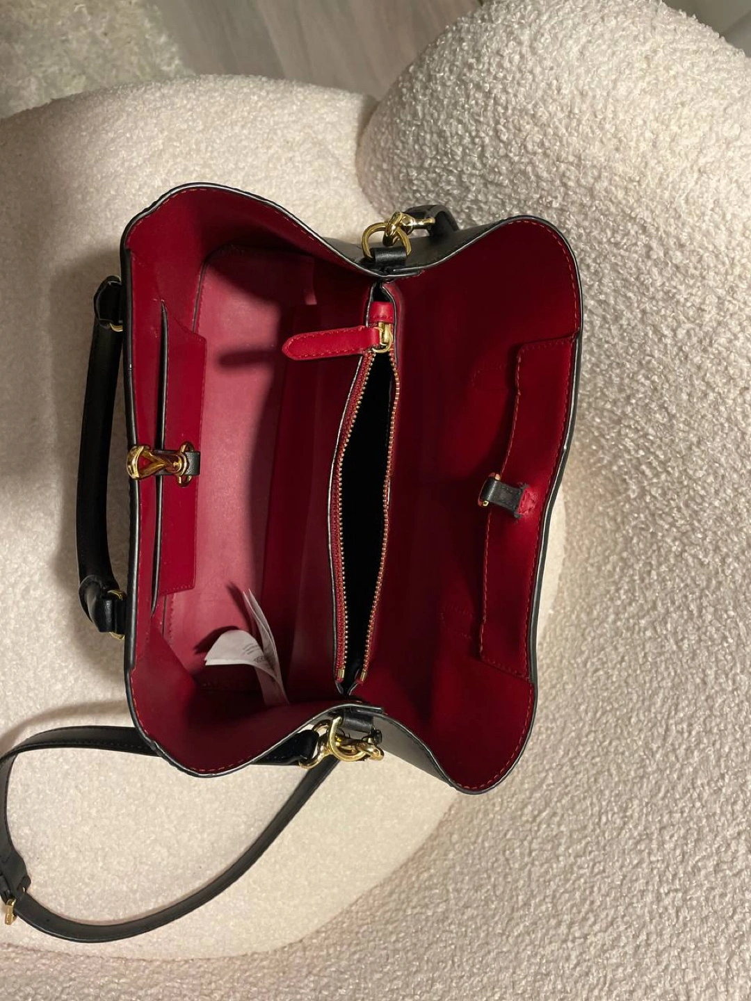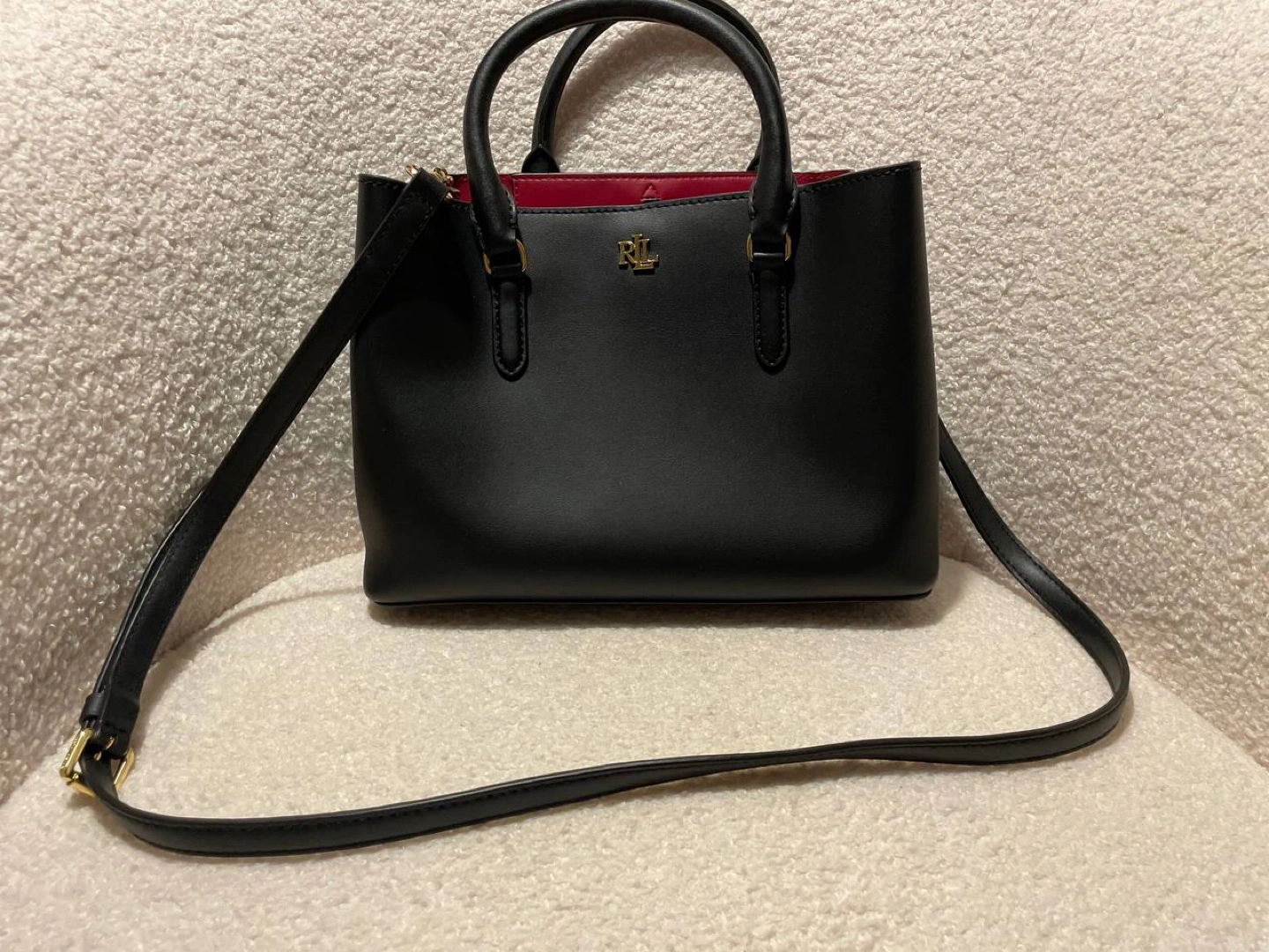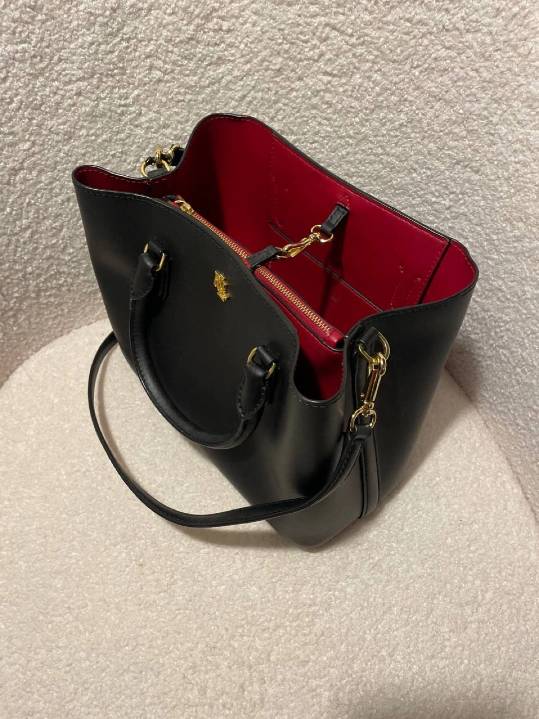 This is a stylish black Ralph Lauren satchel. It's made of leather with a vibrant red interior. Perfect for adding a touch of elegance to any outfit!