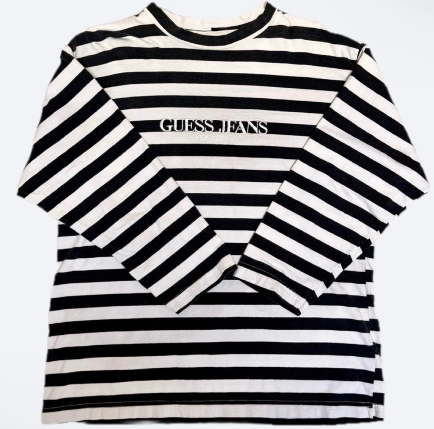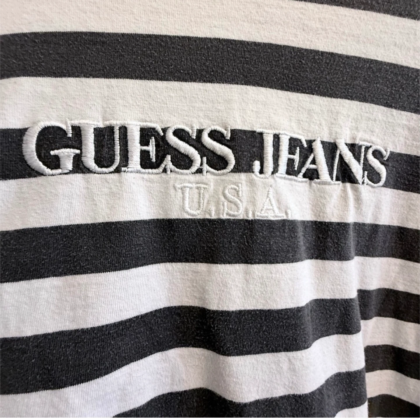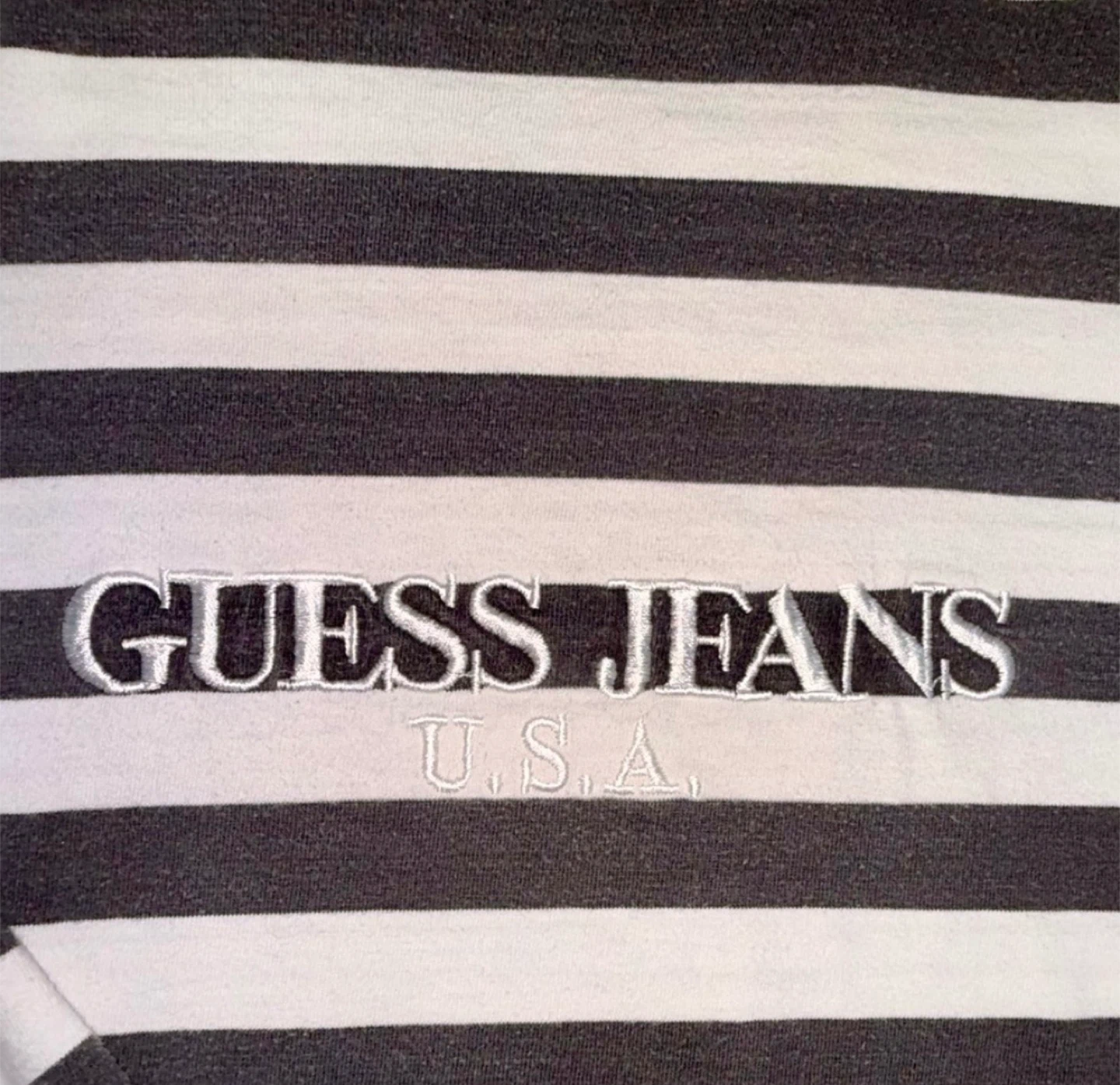 Guess Jeans U.S.A. in white embroidered letters. The stripes are black and white. No damages, stains, rips, or flaws. Just some slight fading, which is to be expected from being in the wash and due to also being from the 90s.