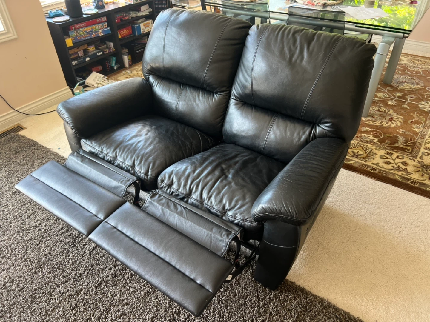 Selling a black leather loveseat recliner. It's in good condition and would be a great addition to any living room or entertainment area. The recliner function works perfectly, making it super comfy for relaxing after a long day!