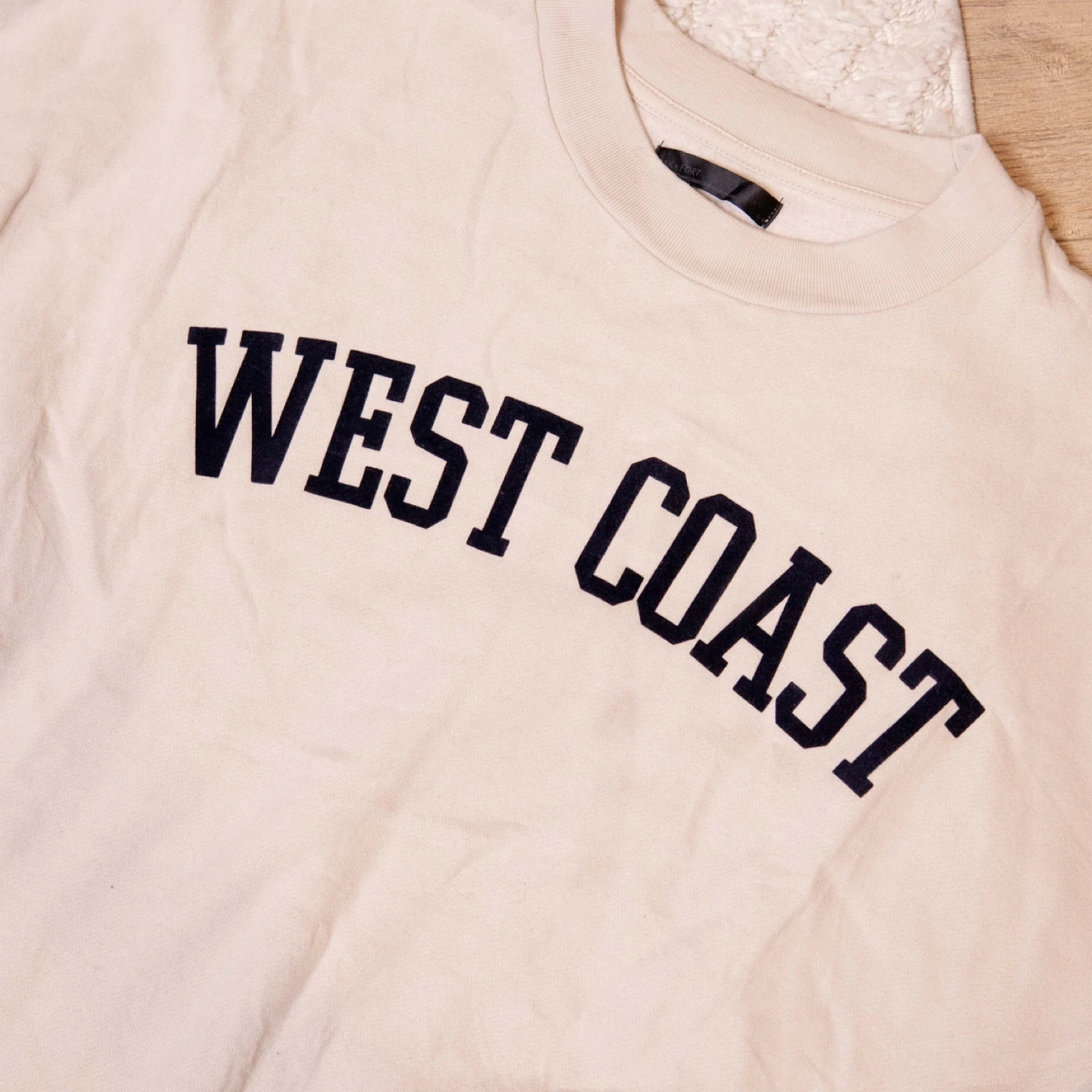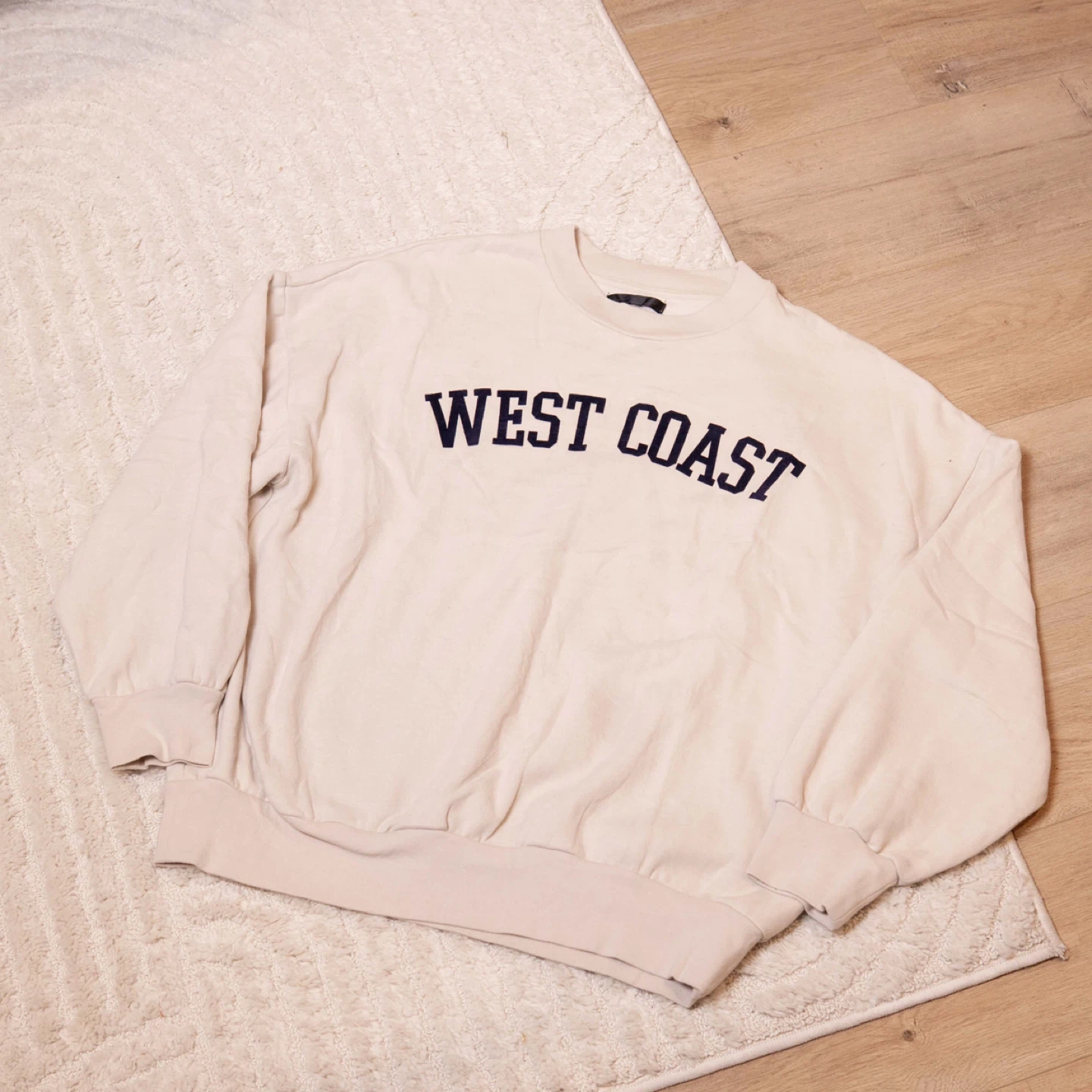 A comfy beige sweatshirt with 'West Coast' printed on the front! It's in great condition and perfect for a casual, laid-back look