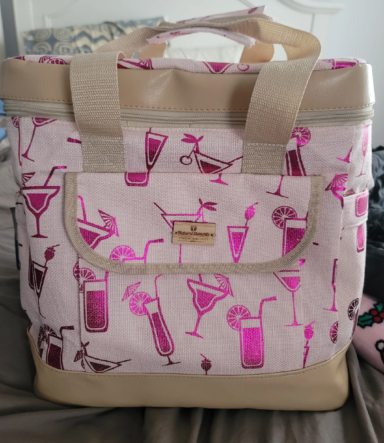 Keep your drinks cool with this Natural Elements insulated cooler bag! It features a fun pink cocktail design. The dimensions are approximately 14" x 8" x 14". Perfect for picnics, beach days, or any outdoor adventure