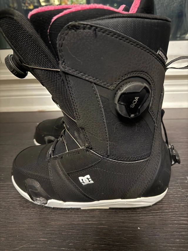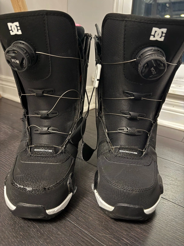 Size US 7W. Get ready to carve up the slopes with these DC snowboard boots! These boots feature the BOA system for easy tightening and a comfortable, pink-lined interior. While they've seen some action, they're still in good condition and ready for more shredding. Note the cosmetic damage on the toe, but they are otherwise in good shape. * Brand: DC * BOA lacing system * Pink interior lining Asking $230 CAD because they are in good condition only wear it 5 times before, with a little bit of cosmetic damage. If the ad is still up, they are available!