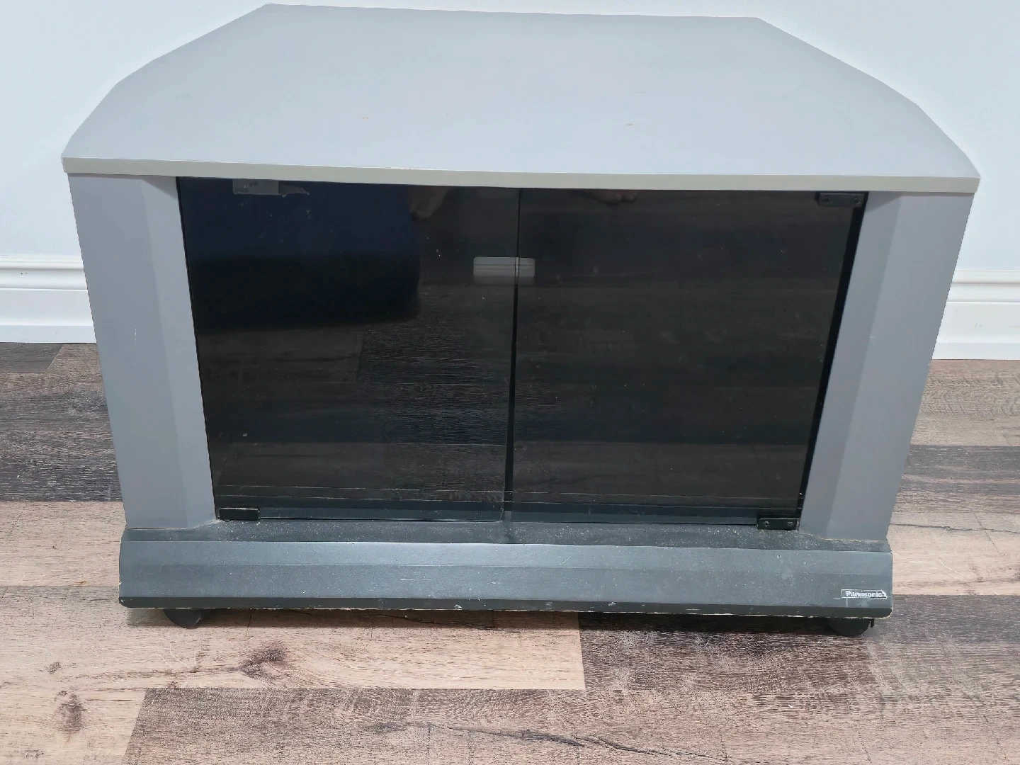 Selling a grey Panasonic TV stand. It has a cabinet with dark tinted glass doors. There are some minor signs of wear and tear, but it's still in good condition and fully functional. Great for storing your media devices!