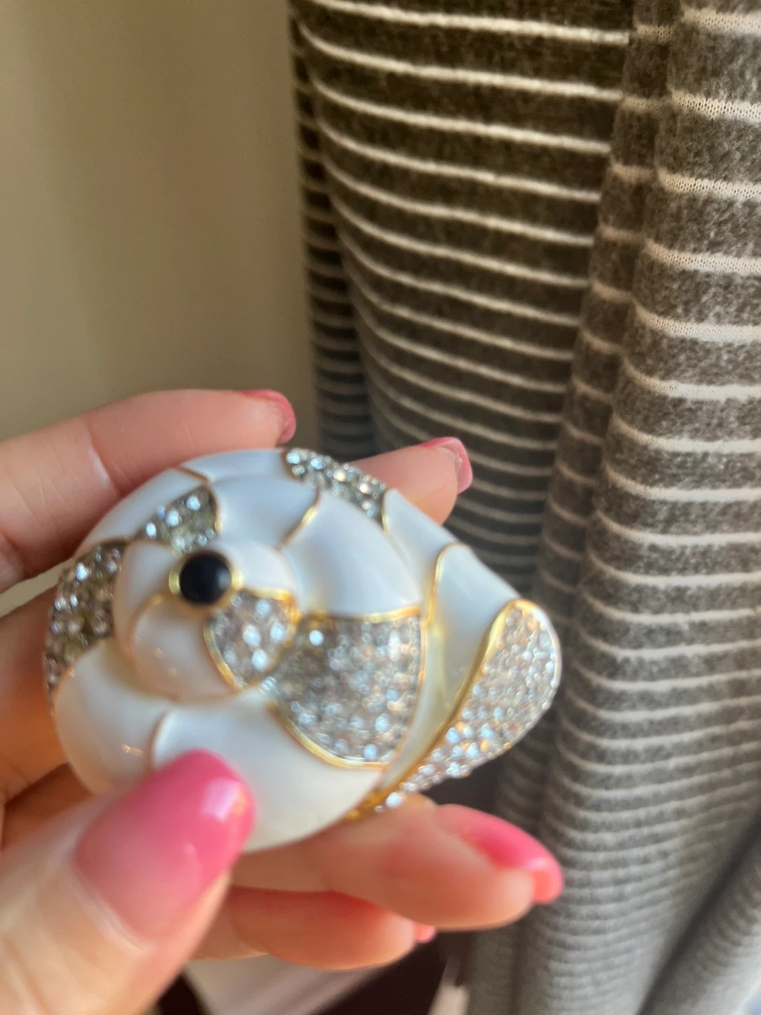 This vintage shell brooch is a unique piece! It features a white enamel shell design, accented with sparkling rhinestones and gold-tone trim. The back has a gold-tone finish with a pin closure. It's in great condition and ready to add some vintage charm to your outfit!