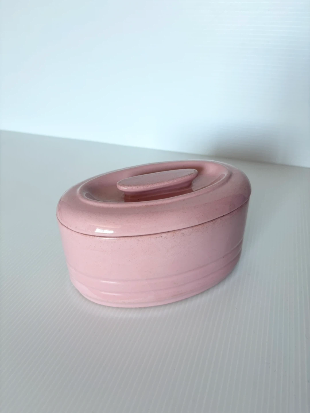 145A Vintage pink oval ceramic dish. Marked sovereign Canada vitrified
