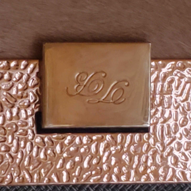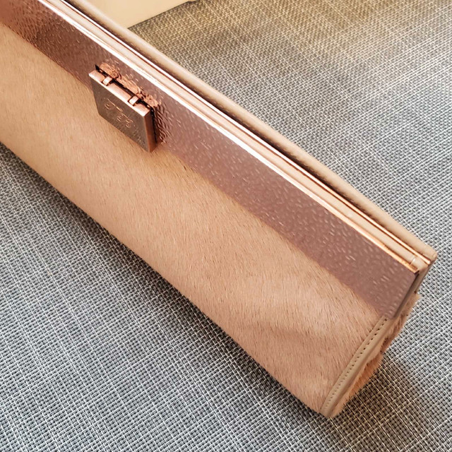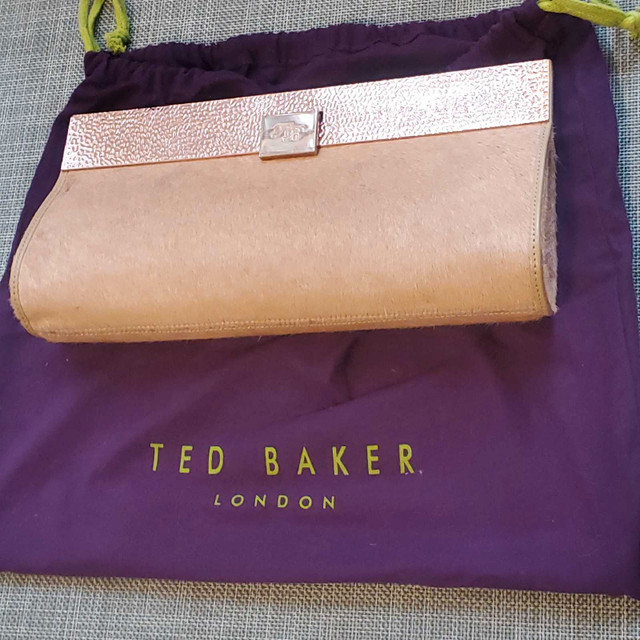 Elevate your ensemble with this chic, Ted Baker clutch, crafted with a distinctive pony hair finish and rose gold hardware, perfect for a night out, adding a touch of character to its sophisticated design. It's in like new condition. Key features include: * Pony hair texture * Rose gold-tone hardware * Secure closure clasp * Internal slip pocket