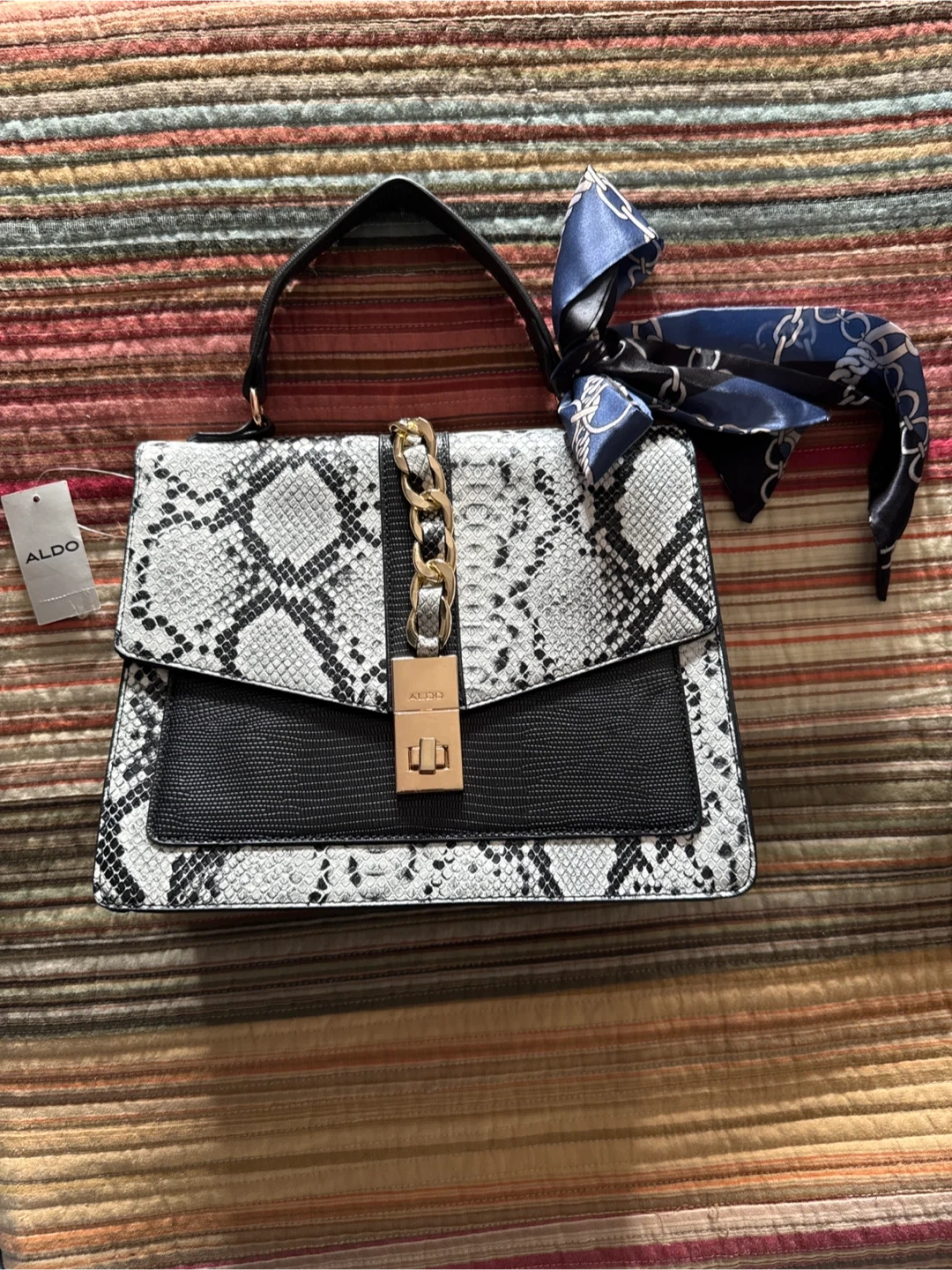 This is a brand new, never used ALDO satchel with a snakeskin print. It features a black handle with long handle attachment of preferred, a decorative scarf and a gold-tone clasp. The bag has a structured shape and includes a tag.