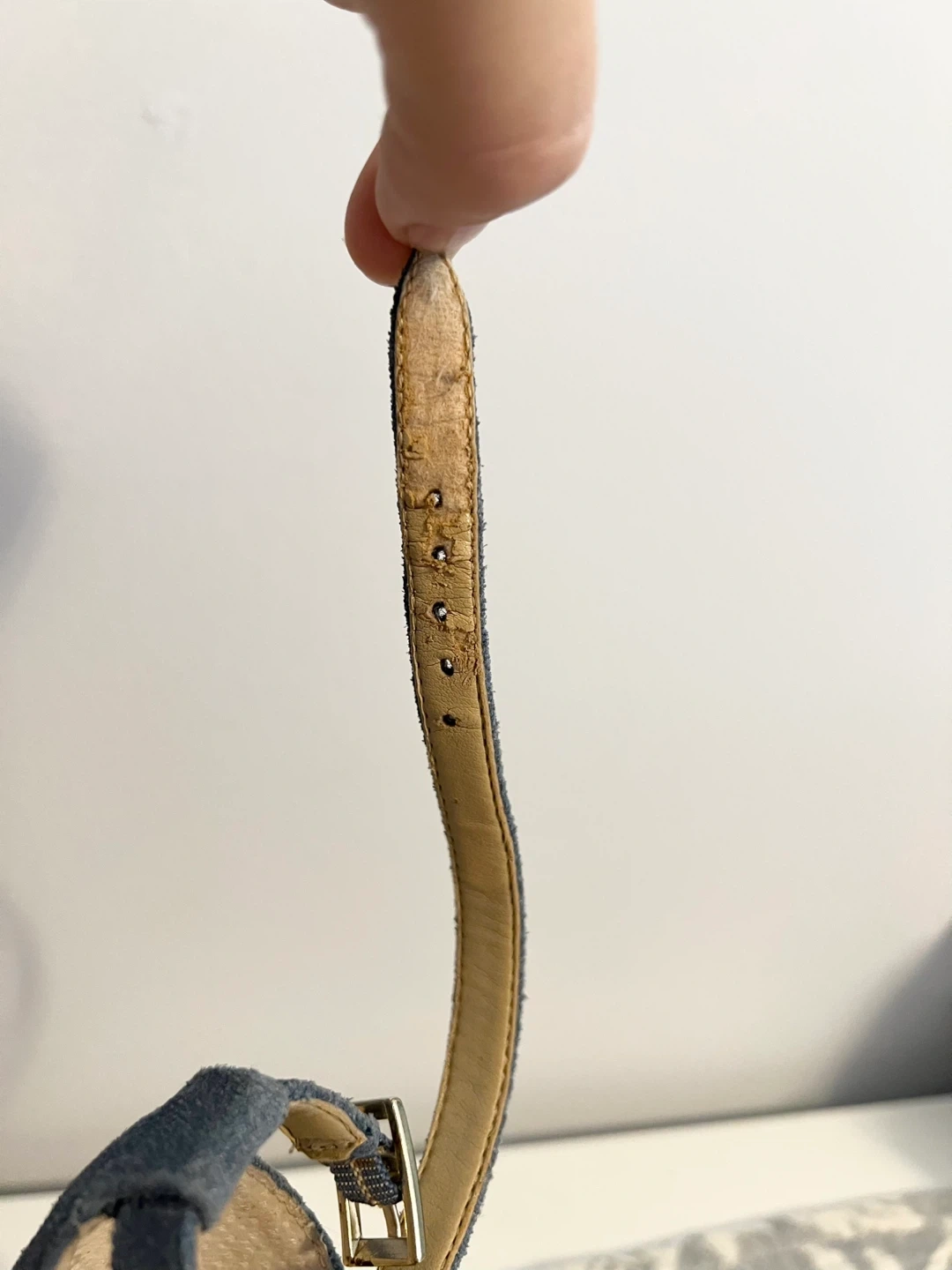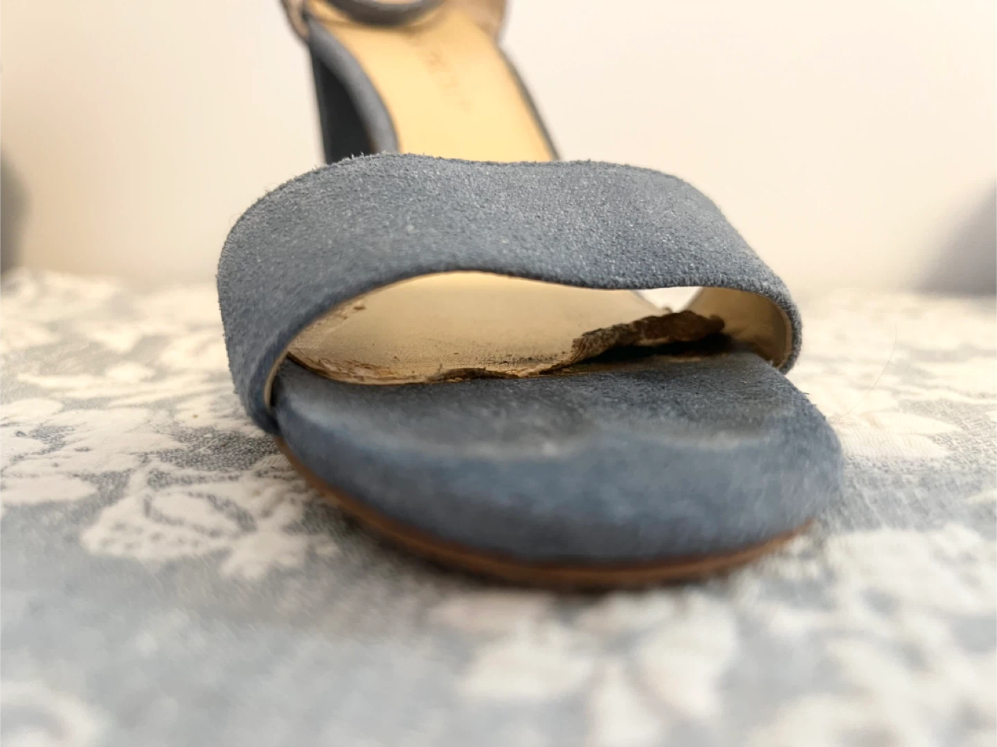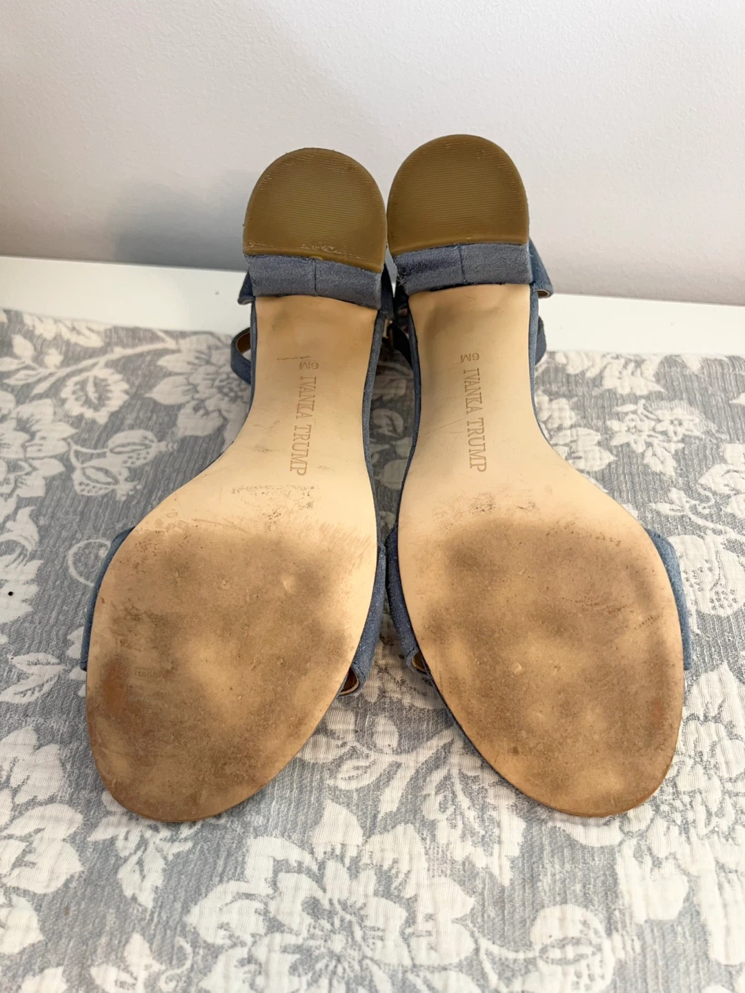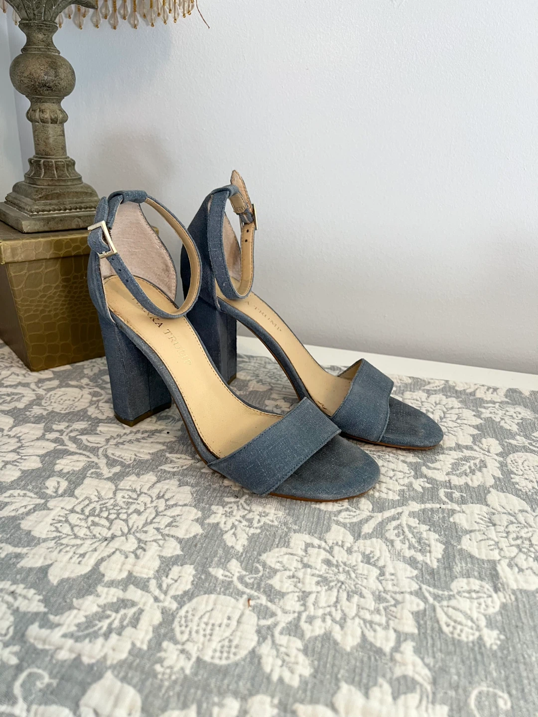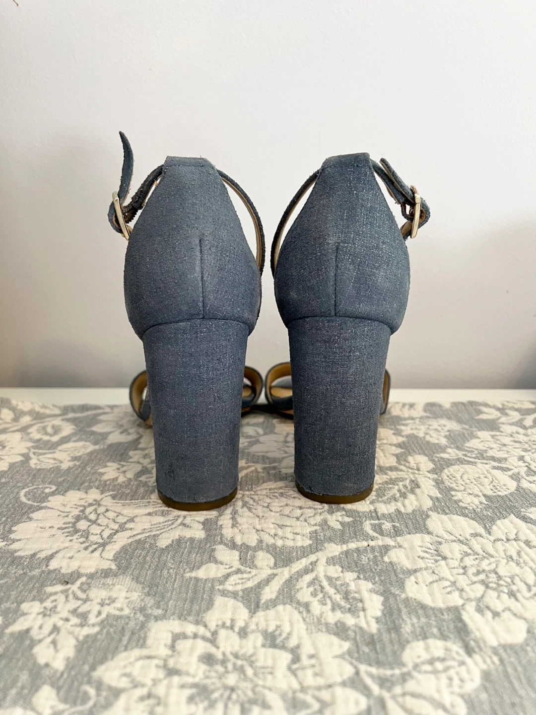 Chic denim blue heels with ankle strap. Stylish block heel design.