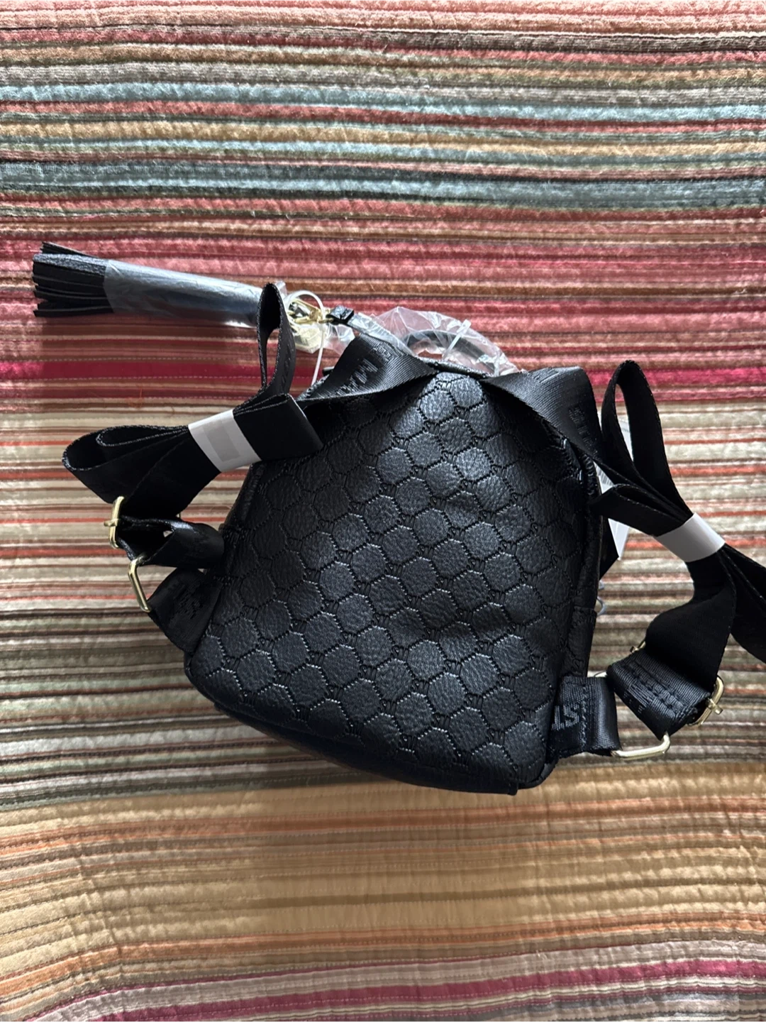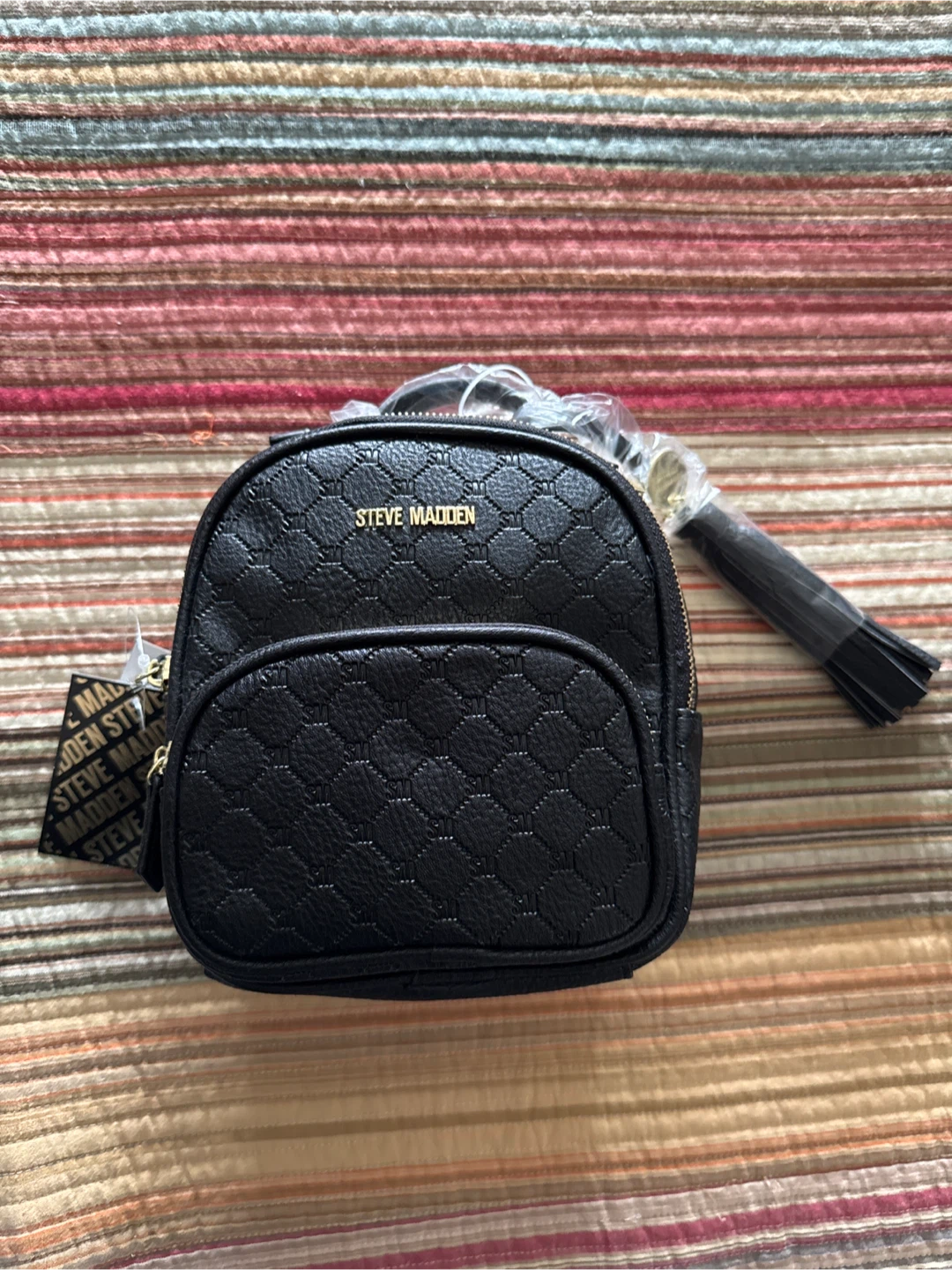 This is a brand new Steve Madden mini backpack! It's black and features a quilted pattern with a stylish yet detachable tassel. Perfect for carrying your essentials in style!