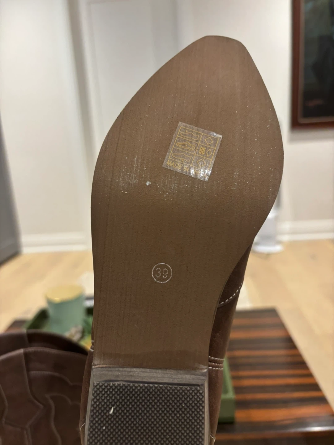 Selling a pair of stylish brown cowboy boots! They're in great condition and would be a fun addition to your wardrobe. The size is marked as 39, which is approximately a US/Canadian size 8