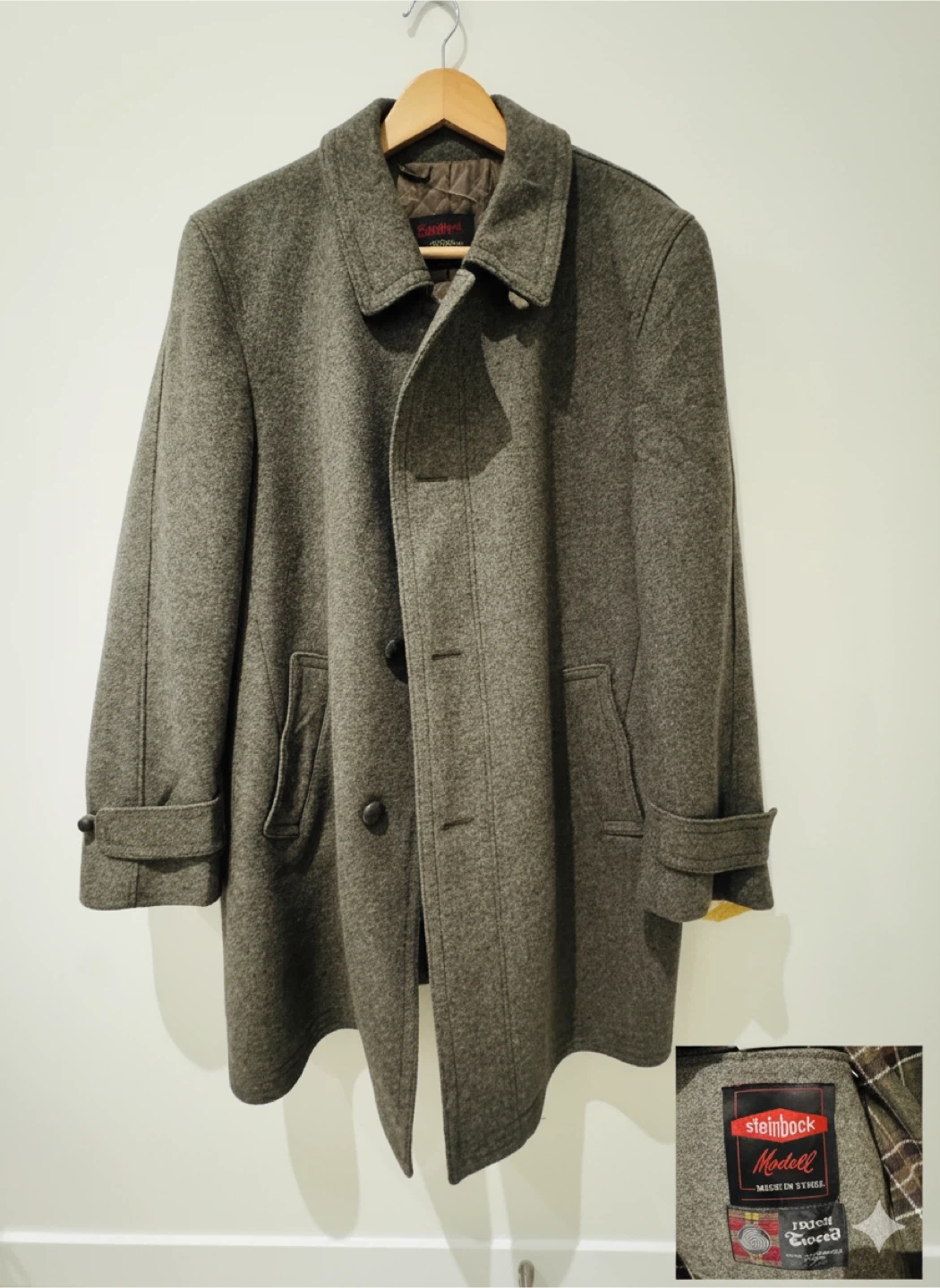 Here's a lovely Steinbock Modell wool coat, made in Austria! It's a stylish and warm piece, perfect for the colder weather. The coat features a classic design with button closures and a comfortable fit. It's in great condition and ready to wear!