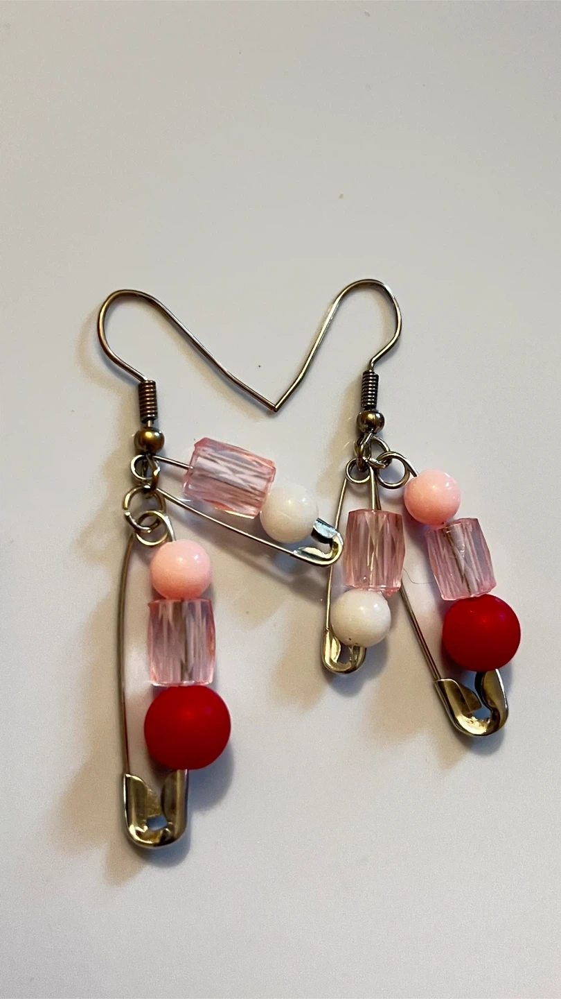 774Selling a pair of handmade earrings. They feature safety pins with red, pink, and white beads. They’re super unique and add a fun touch to any outfit! Handcrafted these myself! Happy to home them to a loving owner ❤️ Let me know if interested in purchasing from me thx 🙏💕 Pick up only ☺️ (available between 11am-6pm) Located at Queen and Sherbourne intersection 🙌 Check out my listings for more deals! 🤩 🔥 Bundle items for a discounted price (excluding items $5 and under)🔥