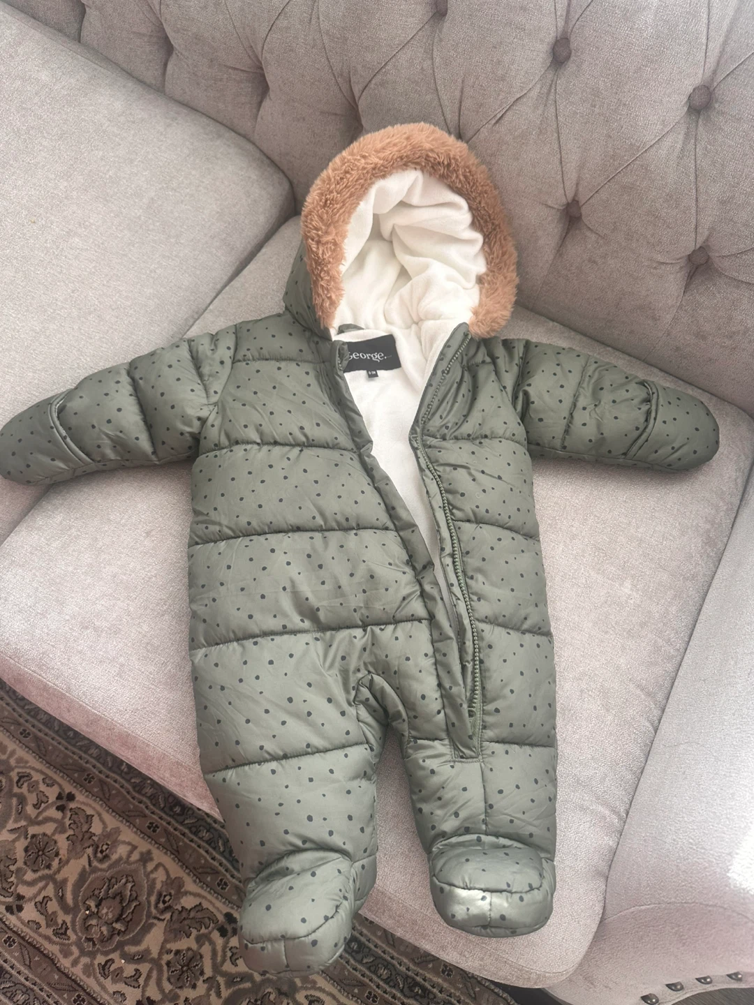 Keep your little one warm with this adorable George baby snowsuit! It's in great condition and perfect for the winter months. The size is 3-12