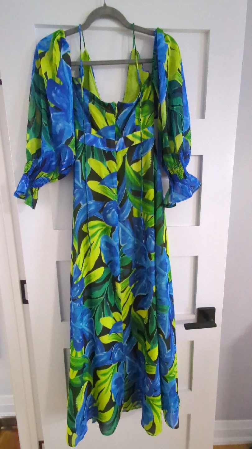65RNWY- Beautiful ANNA dress with a vibrant blue and green floral pattern! It features a flattering silhouette and lightweight material, perfect for any occasion