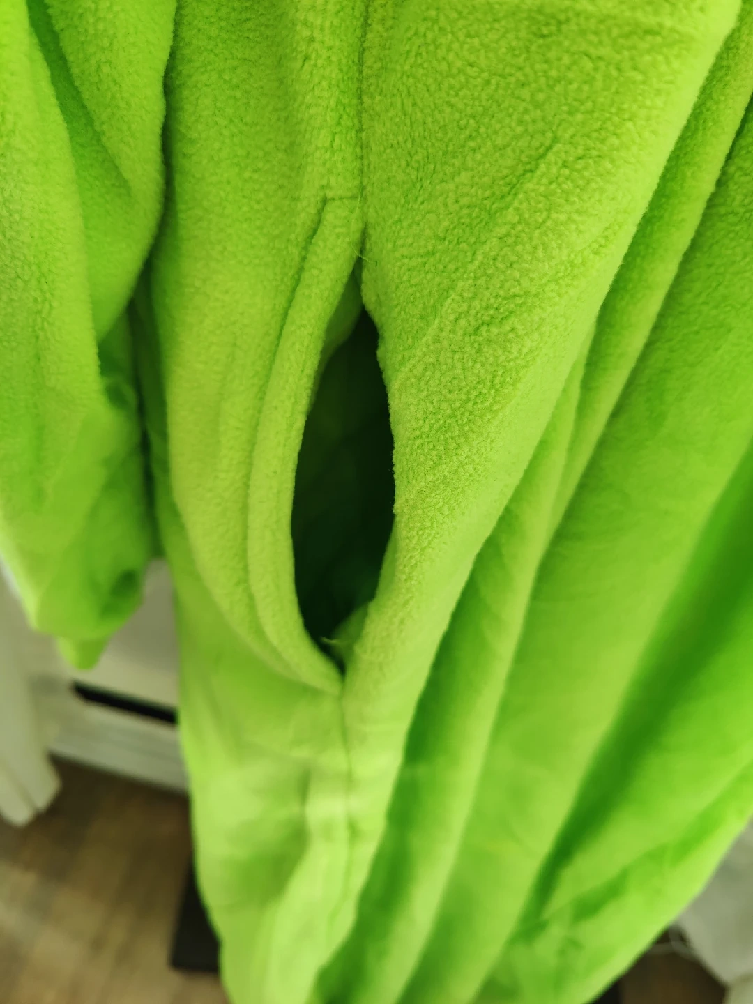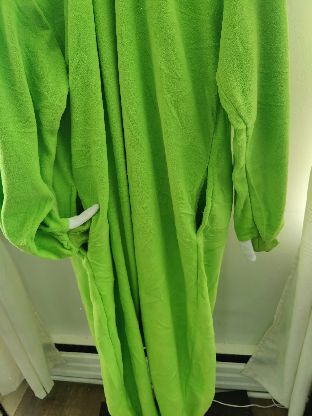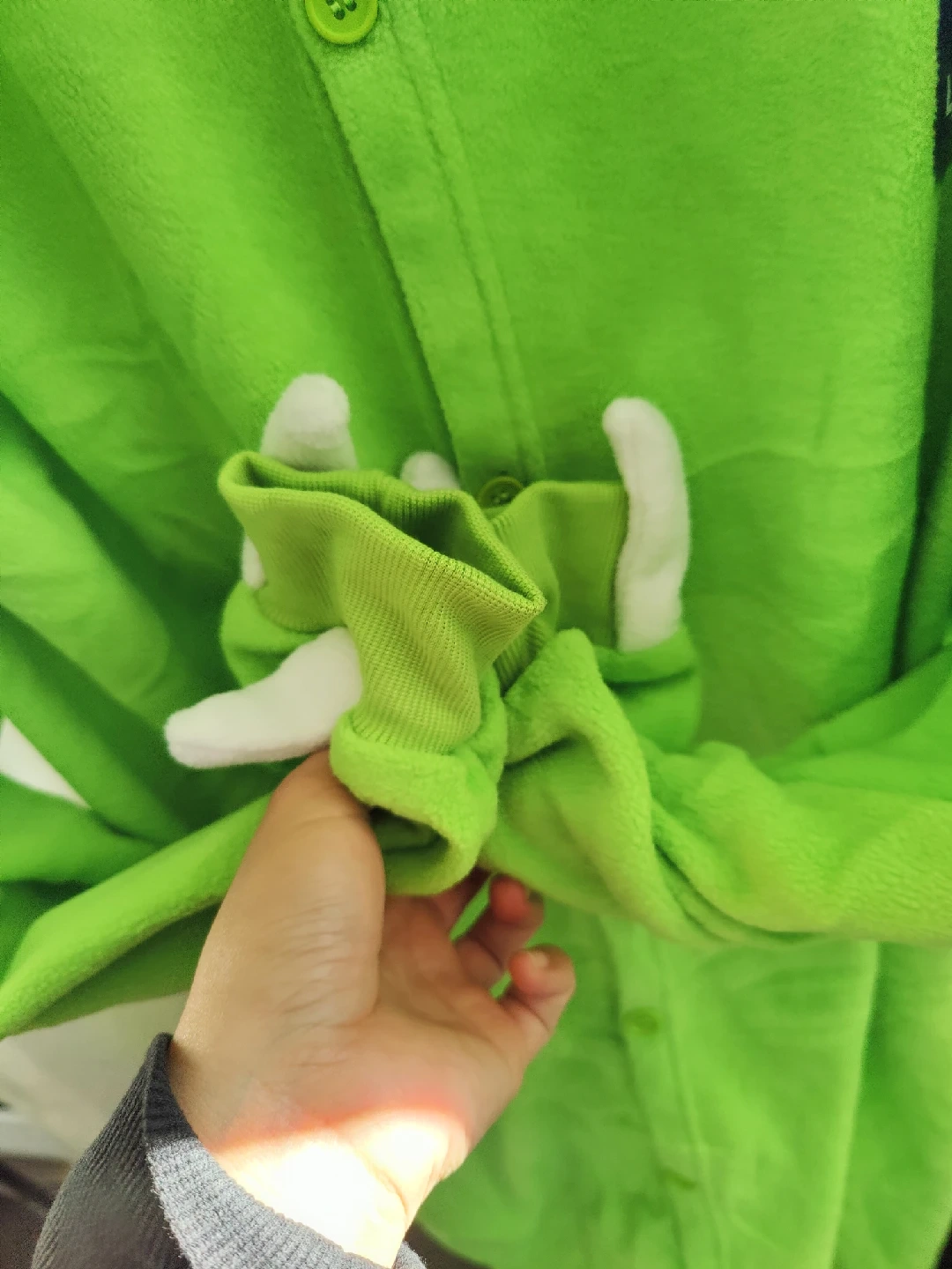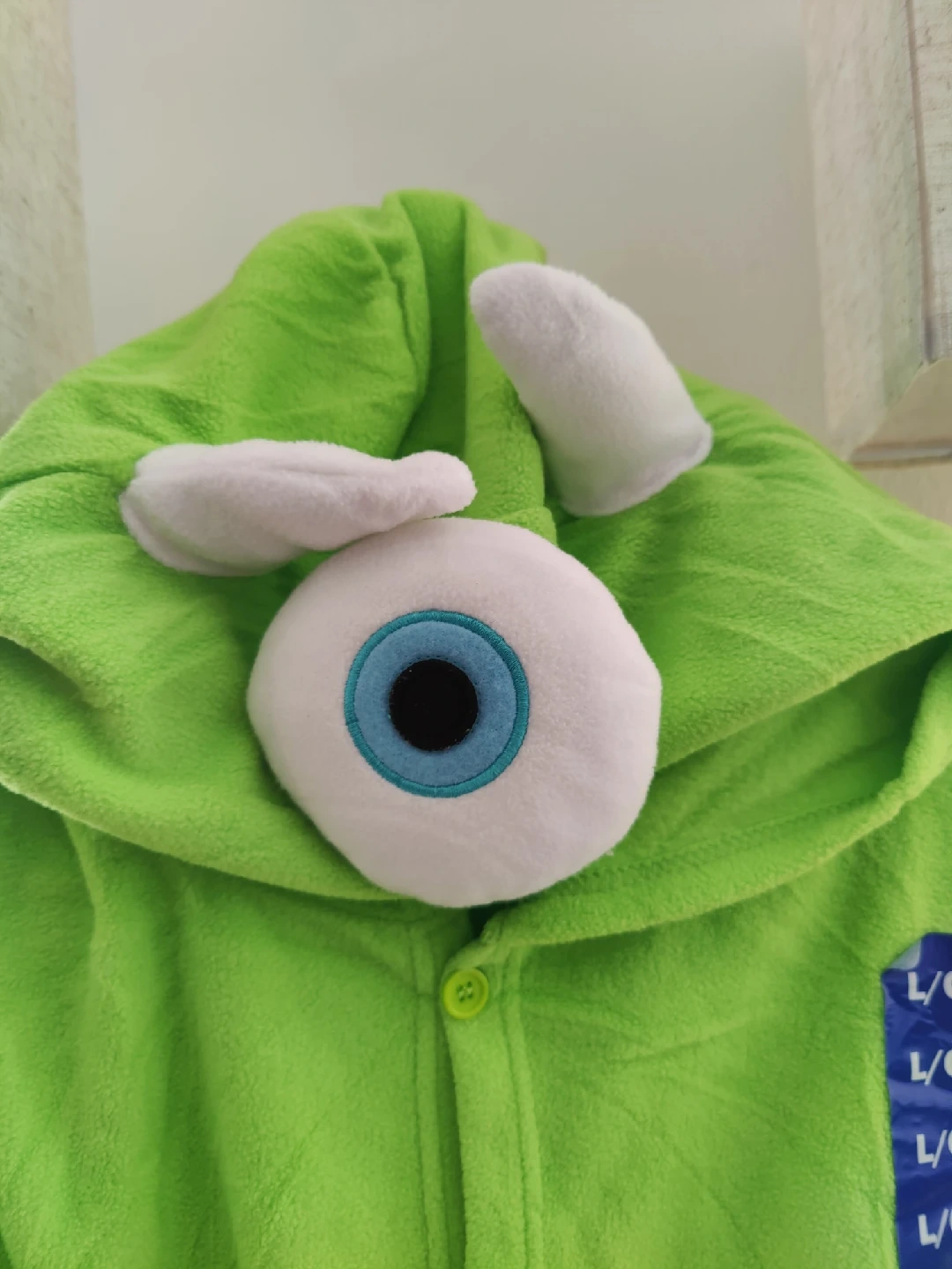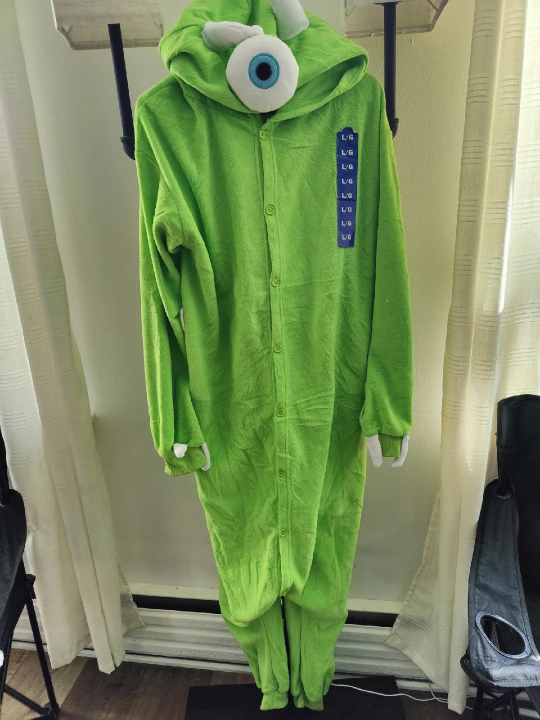 26Snuggle up in this adorable Mike Wazowski onesie! It's a cozy green fleece, perfect for lounging around the house. It has a fun design with Mike's signature eye and horns on the hood. The size is L/G.