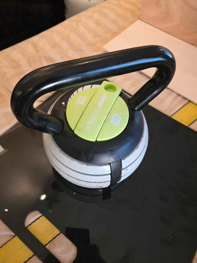 Get ready to pump some iron with this Go Zone adjustable kettlebell, perfect for a variety of strength training exercises! This kettlebell allows you to easily adjust the weight from 18 to 40 lbs (8.2 to 18.1 kg), making it ideal for users of all fitness levels. As you can see it is in used condition.